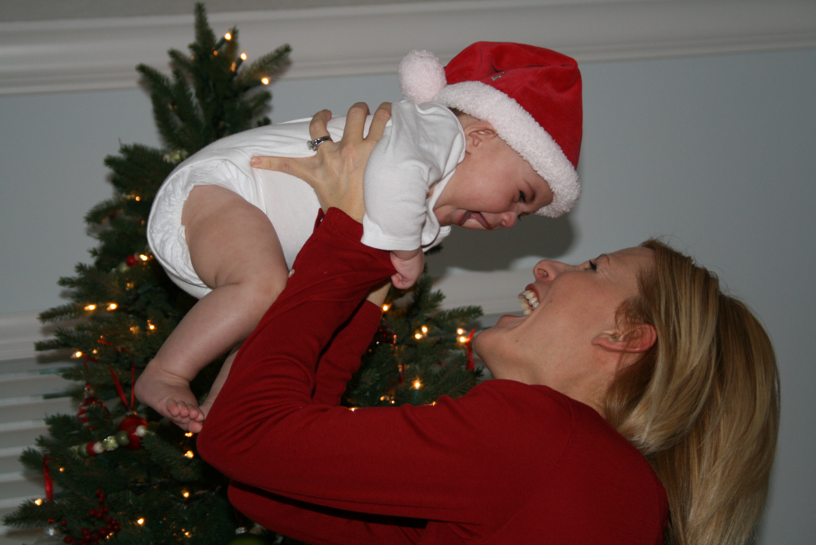 A mother in a red jacket joyfully lifts her baby wearing a Santa hat near a Christmas tree.