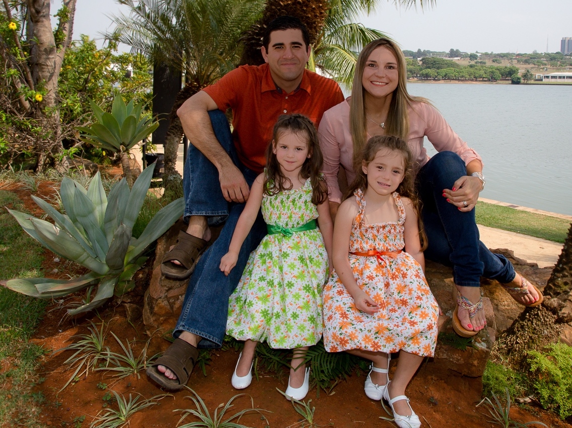 Family portrait painting, parents and two young daughters sitting outdoors by a lake.