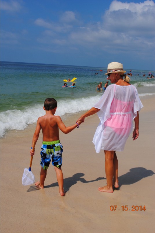 Woman and child holding hands walking on a beach.