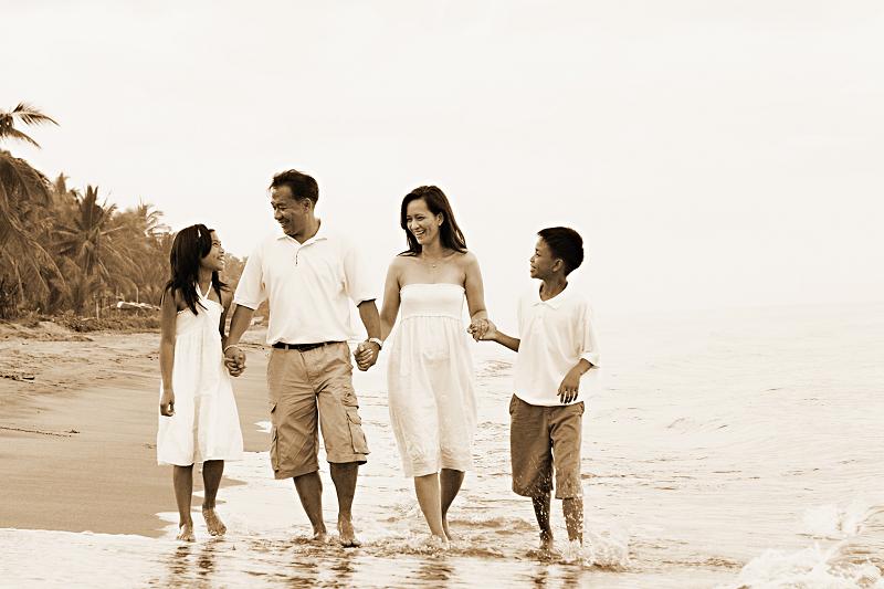 Family portrait: parents and two children holding hands and walking in shallow ocean water.