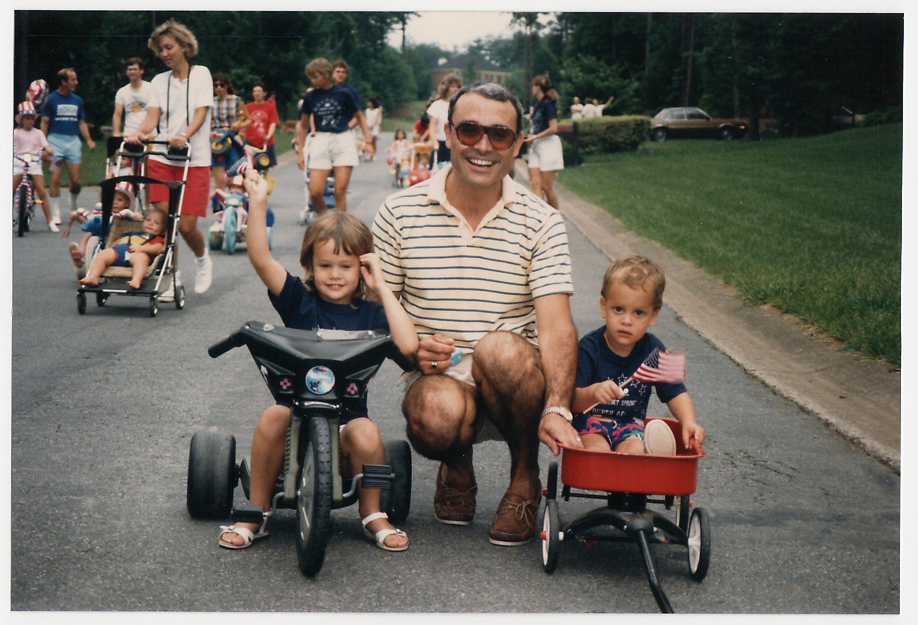 Painting of a father and his two young children, one child is on a tricycle, the other in a wagon, and they are holding small American flags.