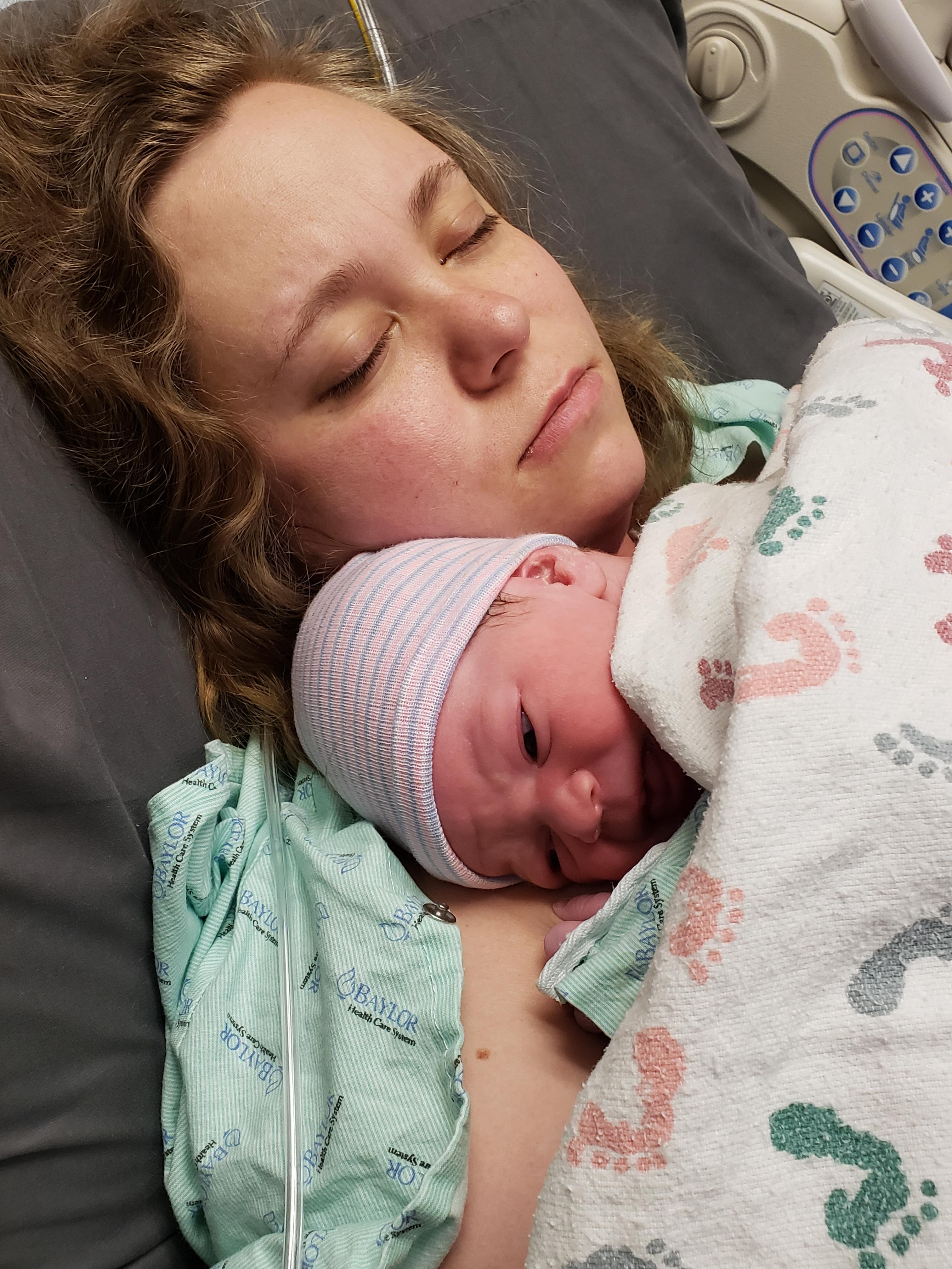 Painting of a mother sleeping with her newborn baby on her chest.