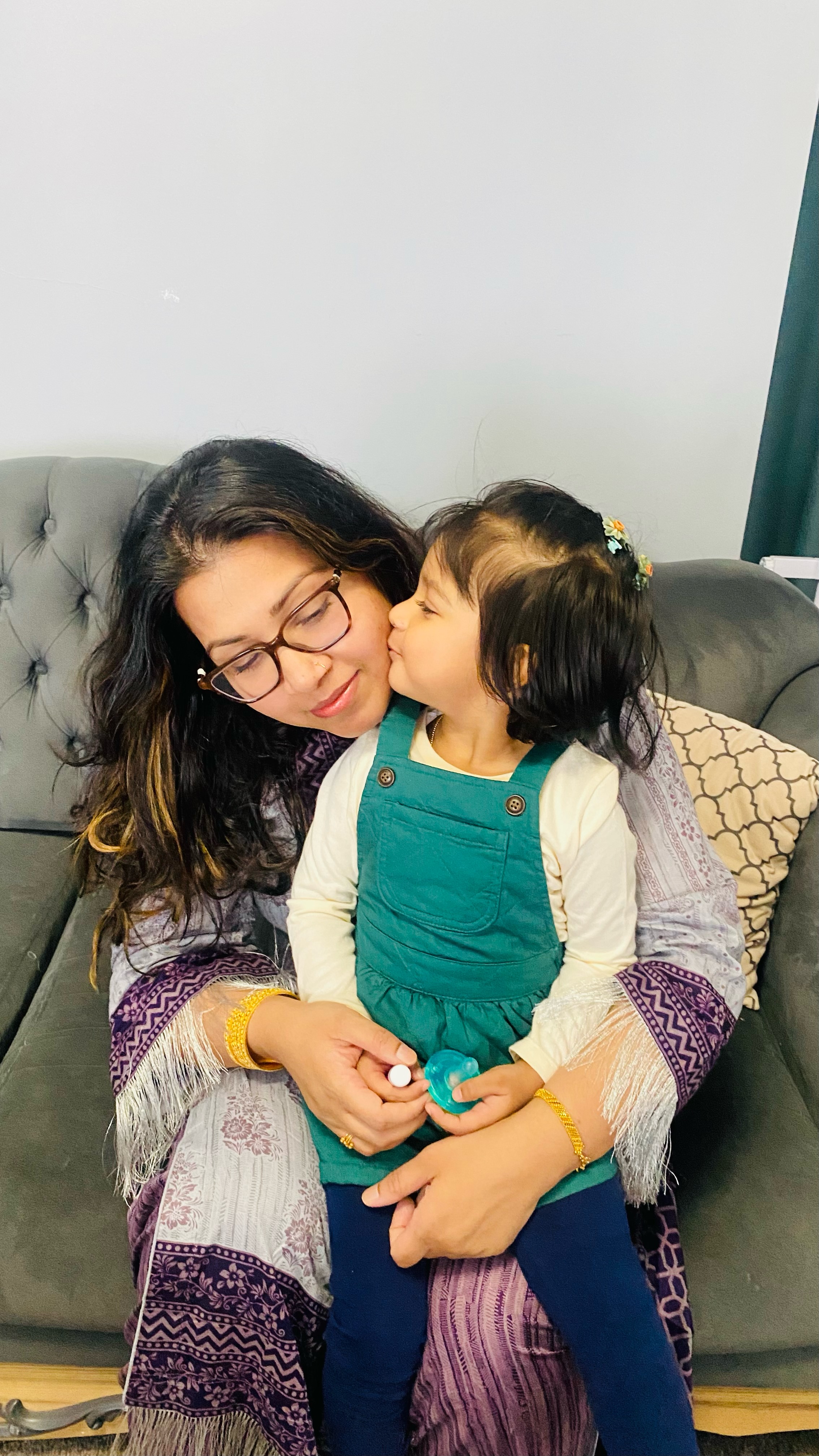 Painting of a mother and daughter, the toddler kisses her mother`s cheek.