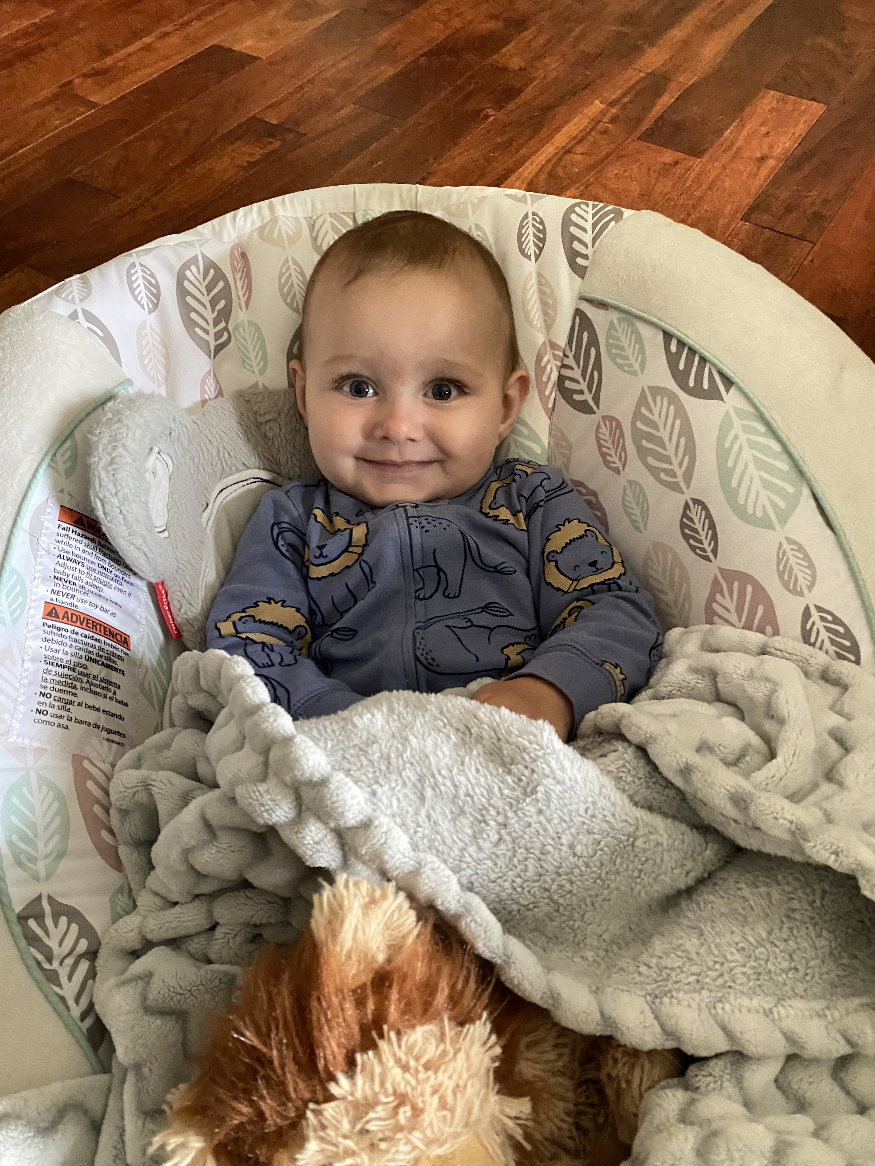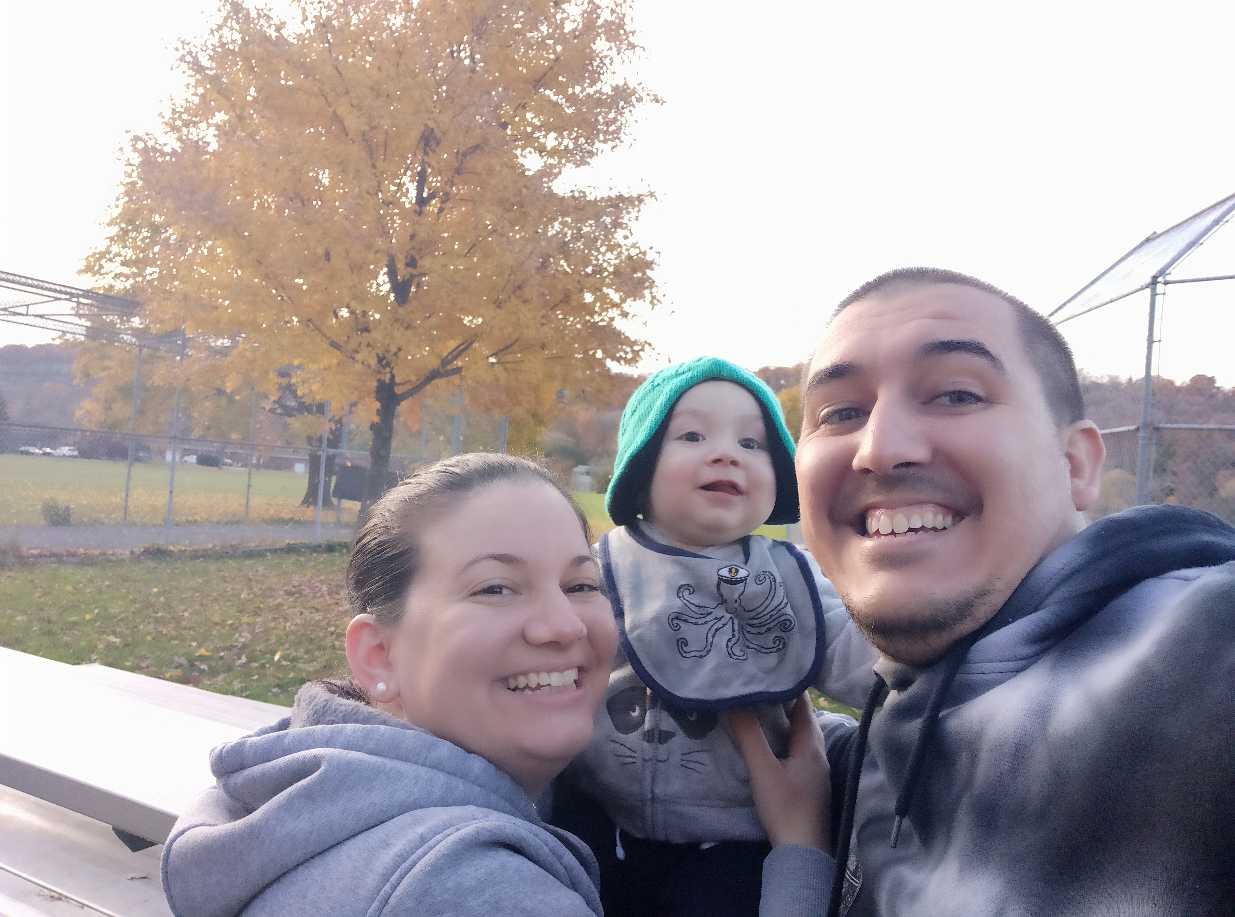 Painting of a family portrait: a smiling man in a black hat, a smiling woman in a gray jacket, and a smiling toddler in a blue jacket.