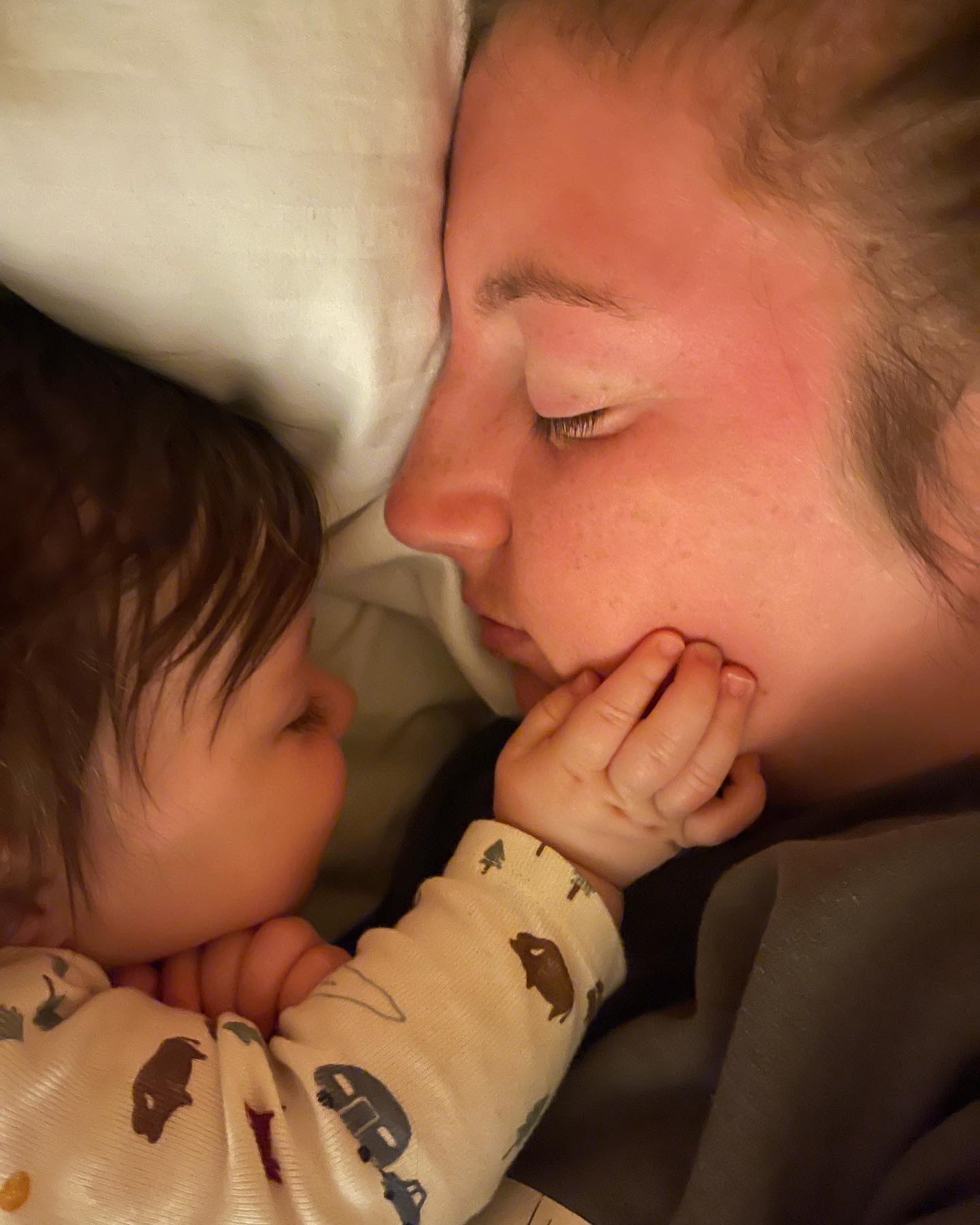 Pastel drawing of a woman and baby sleeping close together.