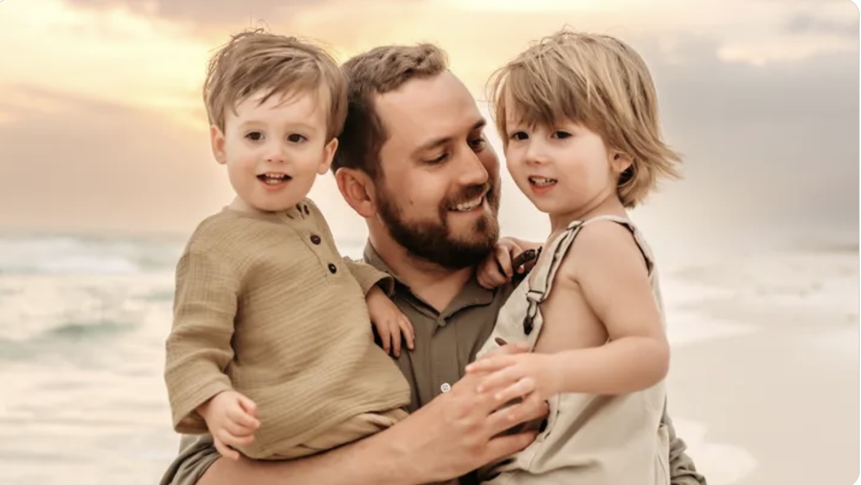 Painting of a father holding his two young children.