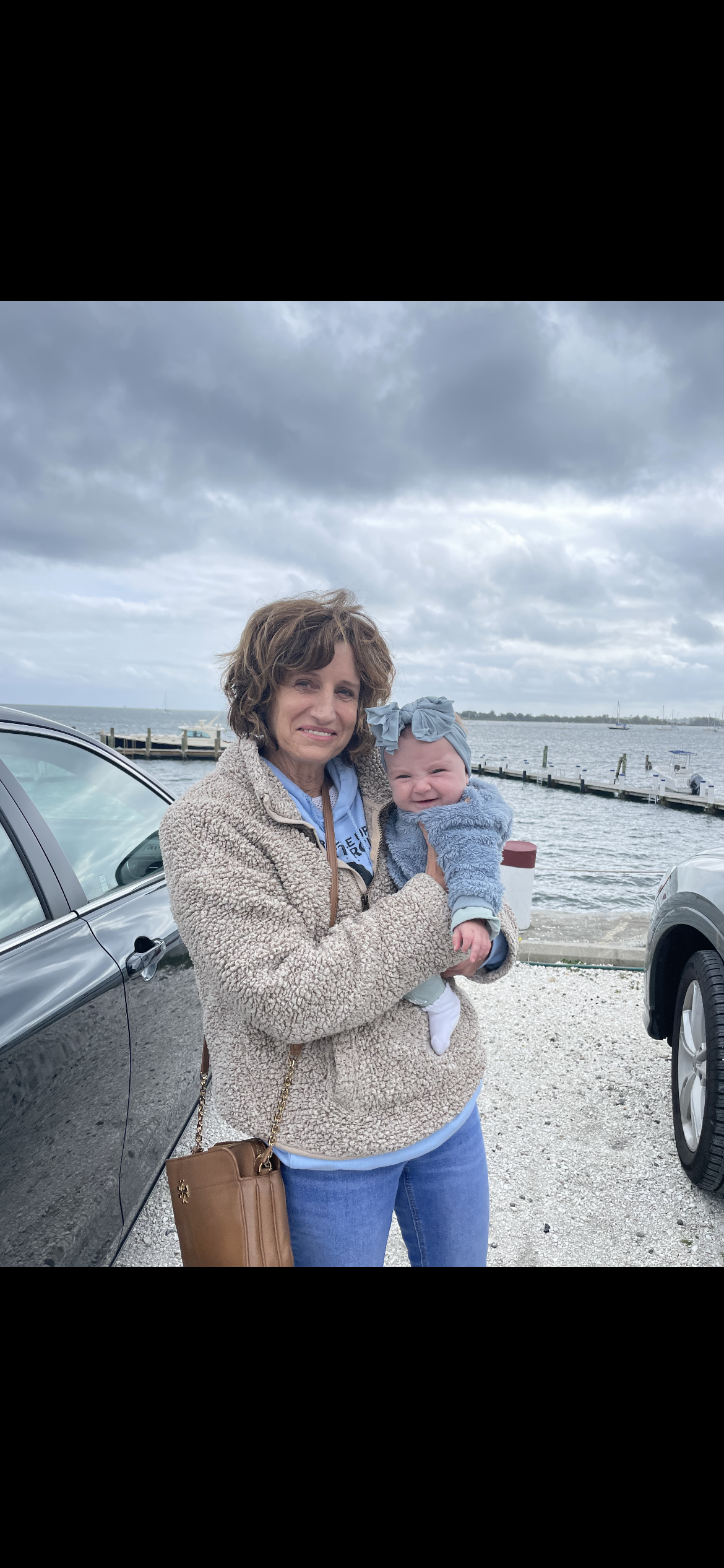 Oil painting of a smiling woman holding a baby wearing a blue coat and headband
