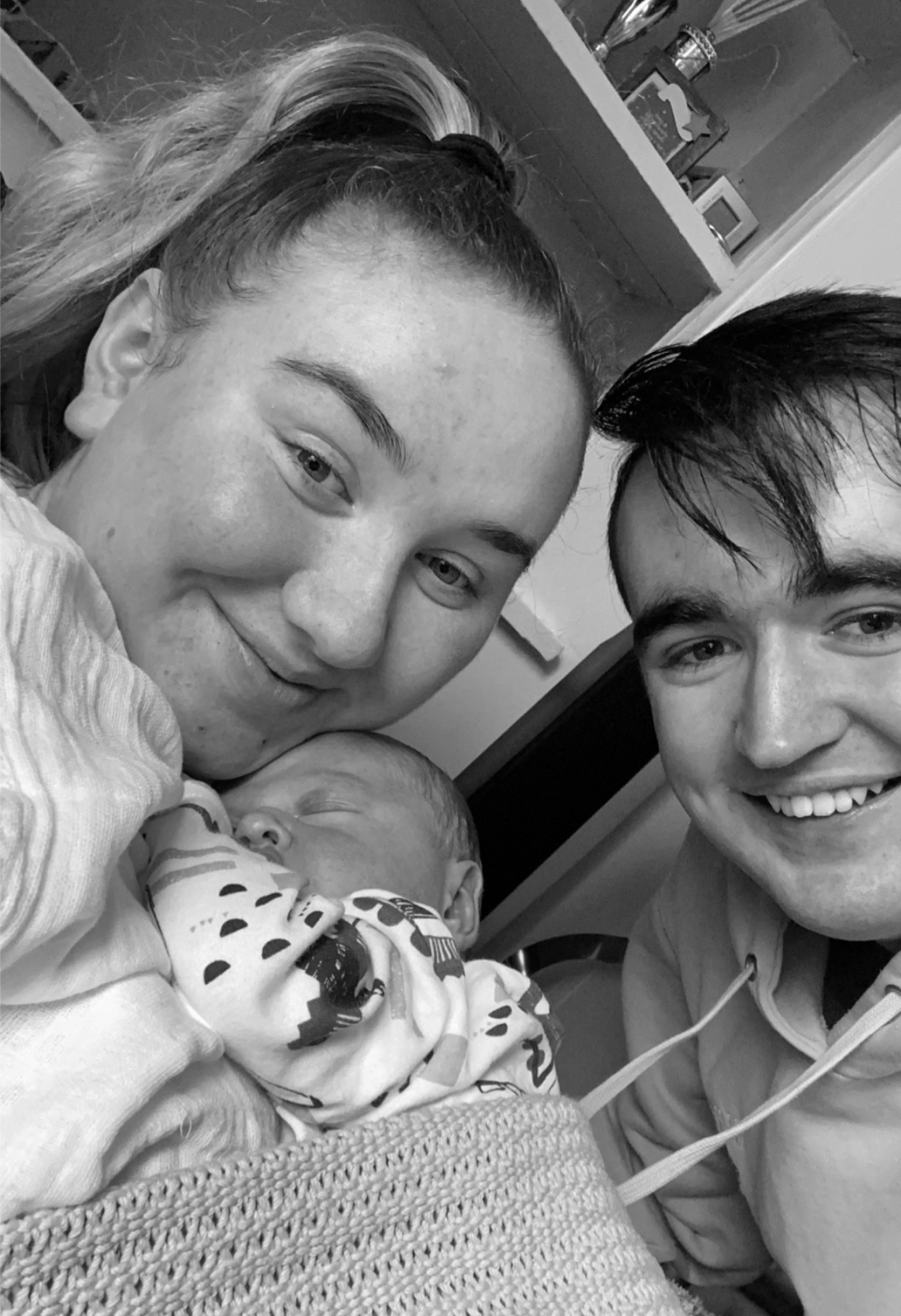 Painting of a mother and her two children, an older toddler lovingly cradles a newborn baby while the mother looks on.