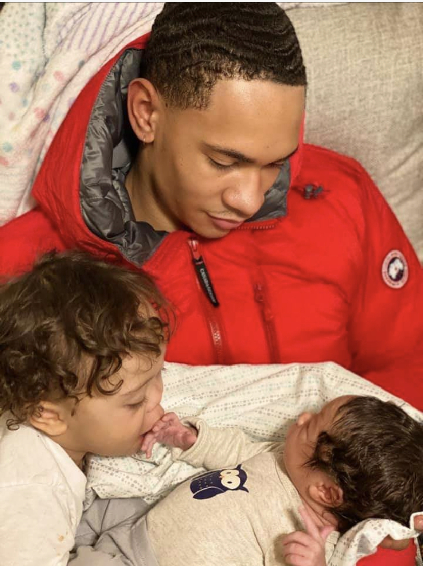Black and white pencil sketch of a father holding his baby.