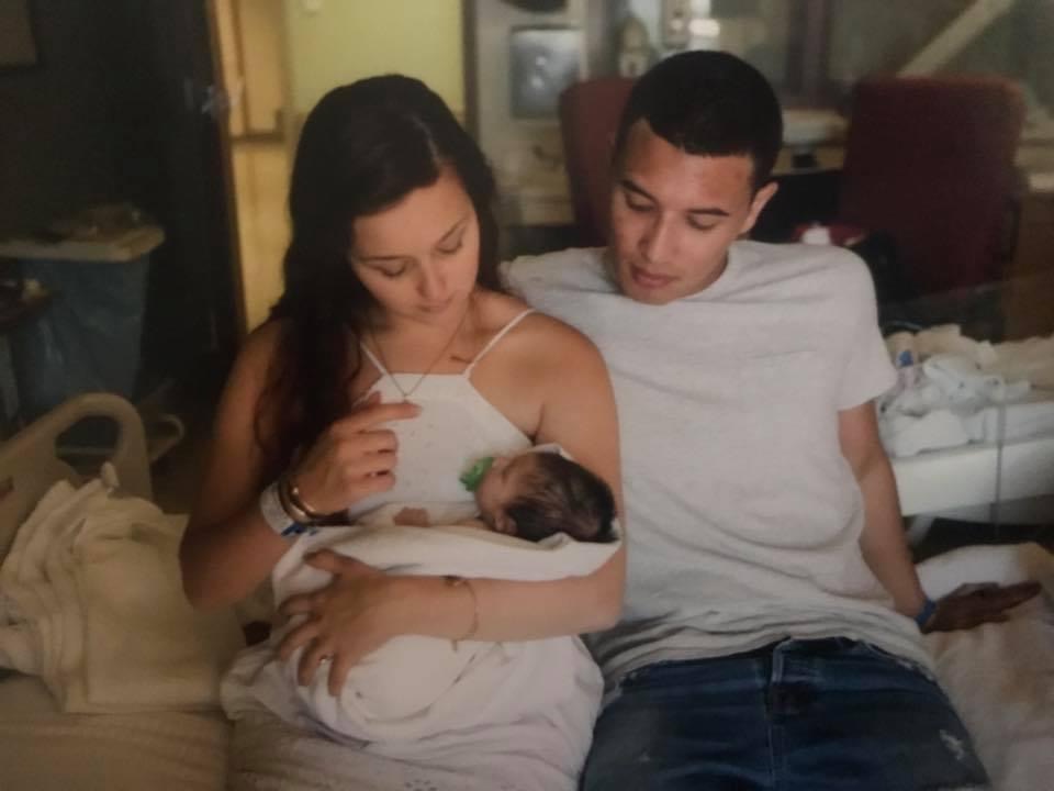Black and white painting of a young couple holding their newborn baby.