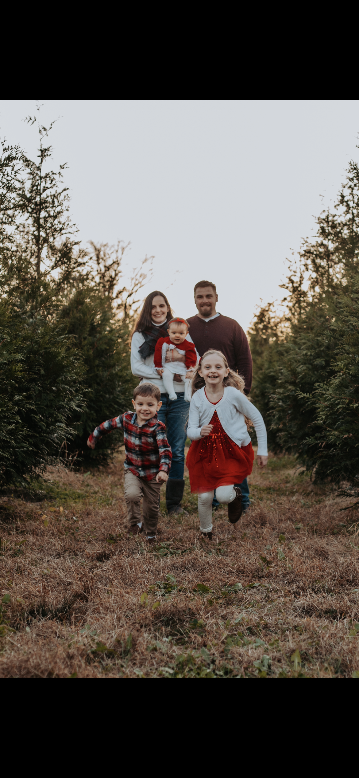 Family portrait painting: parents, baby, girl running, boy running.