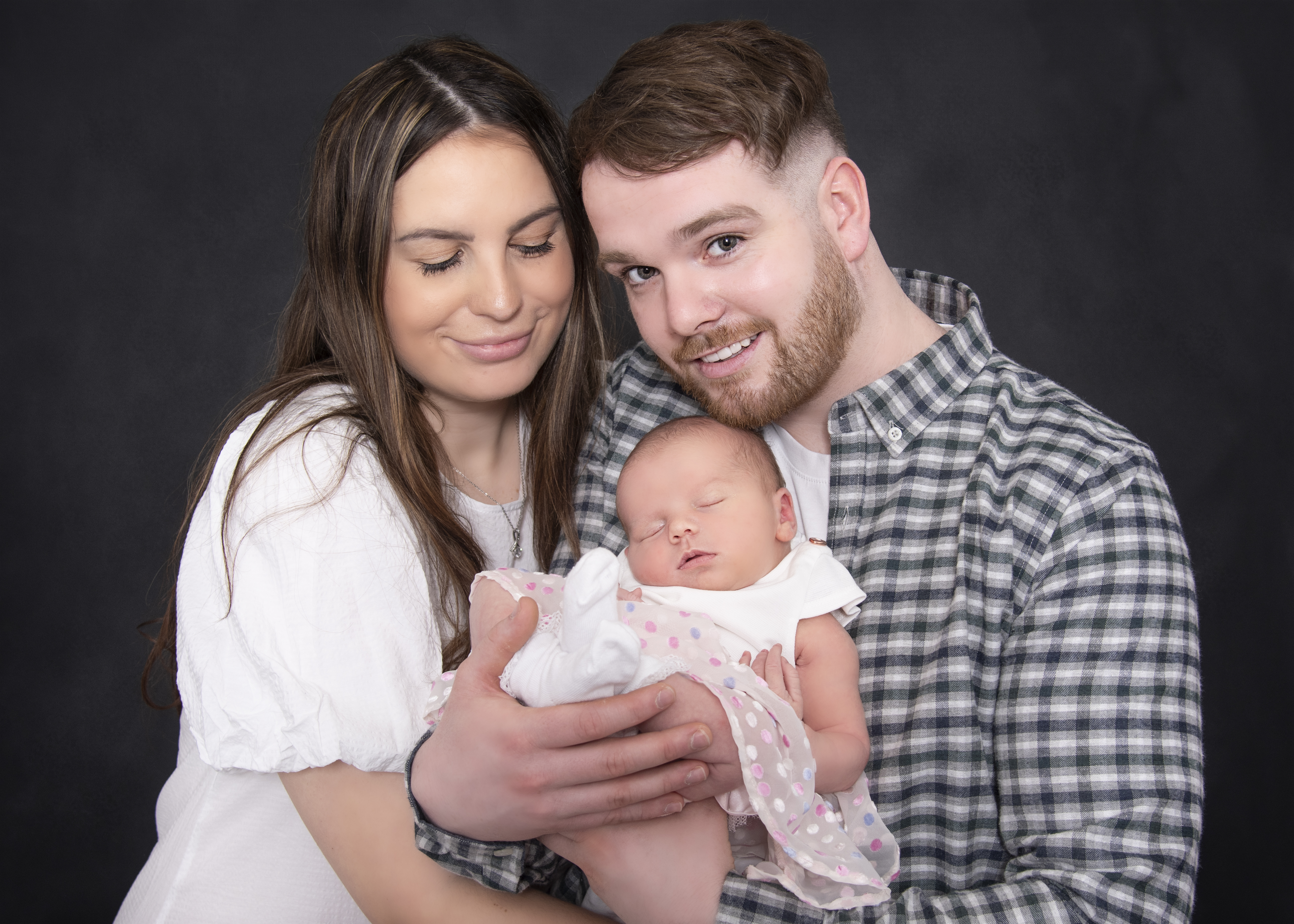 Oil painting of a young family: parents holding their newborn baby.
