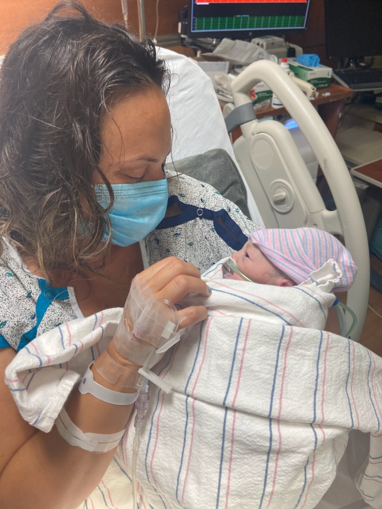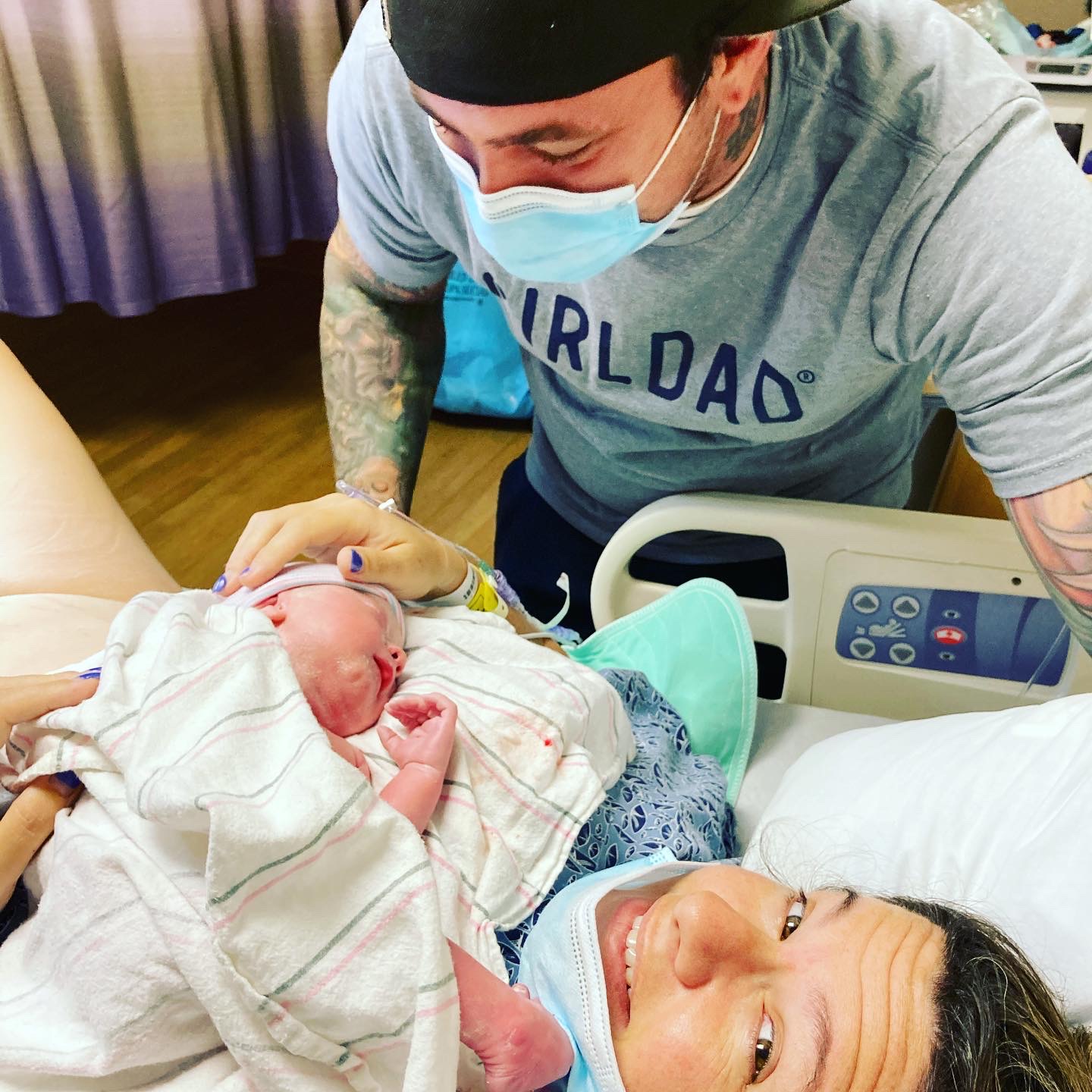 Painting of a new family, father wearing a mask and Girl Dad shirt, looks down at his newborn baby on his mother`s chest.