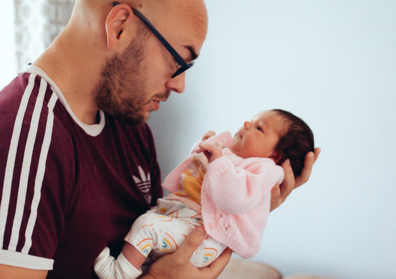 Painting of a father holding his newborn baby girl.