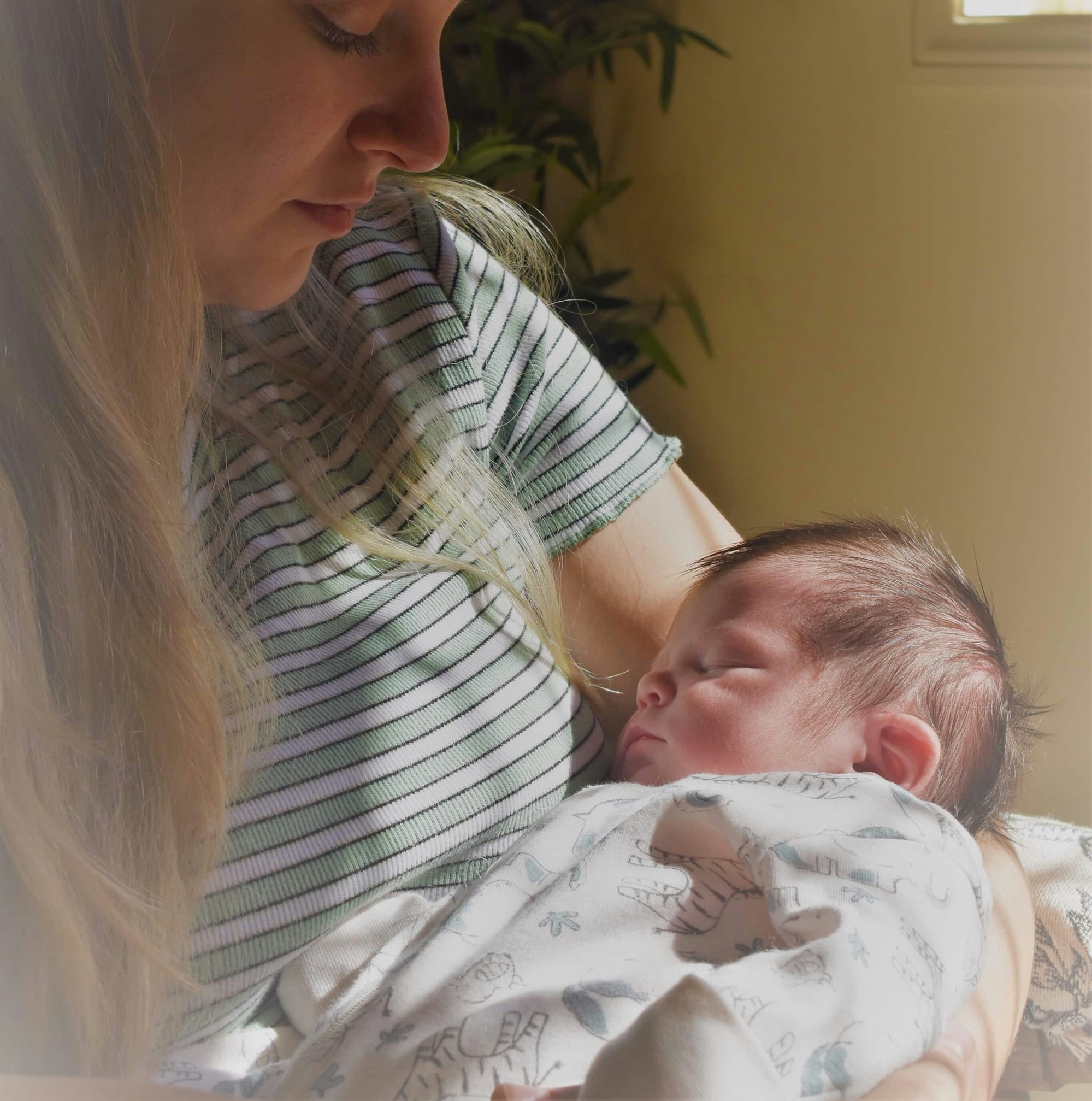 Painting of a mother holding her sleeping newborn baby.
