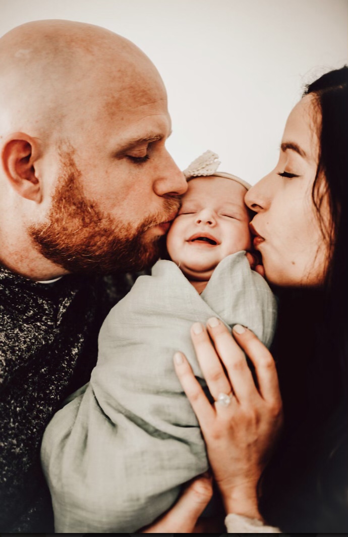 Parents kissing their newborn baby.