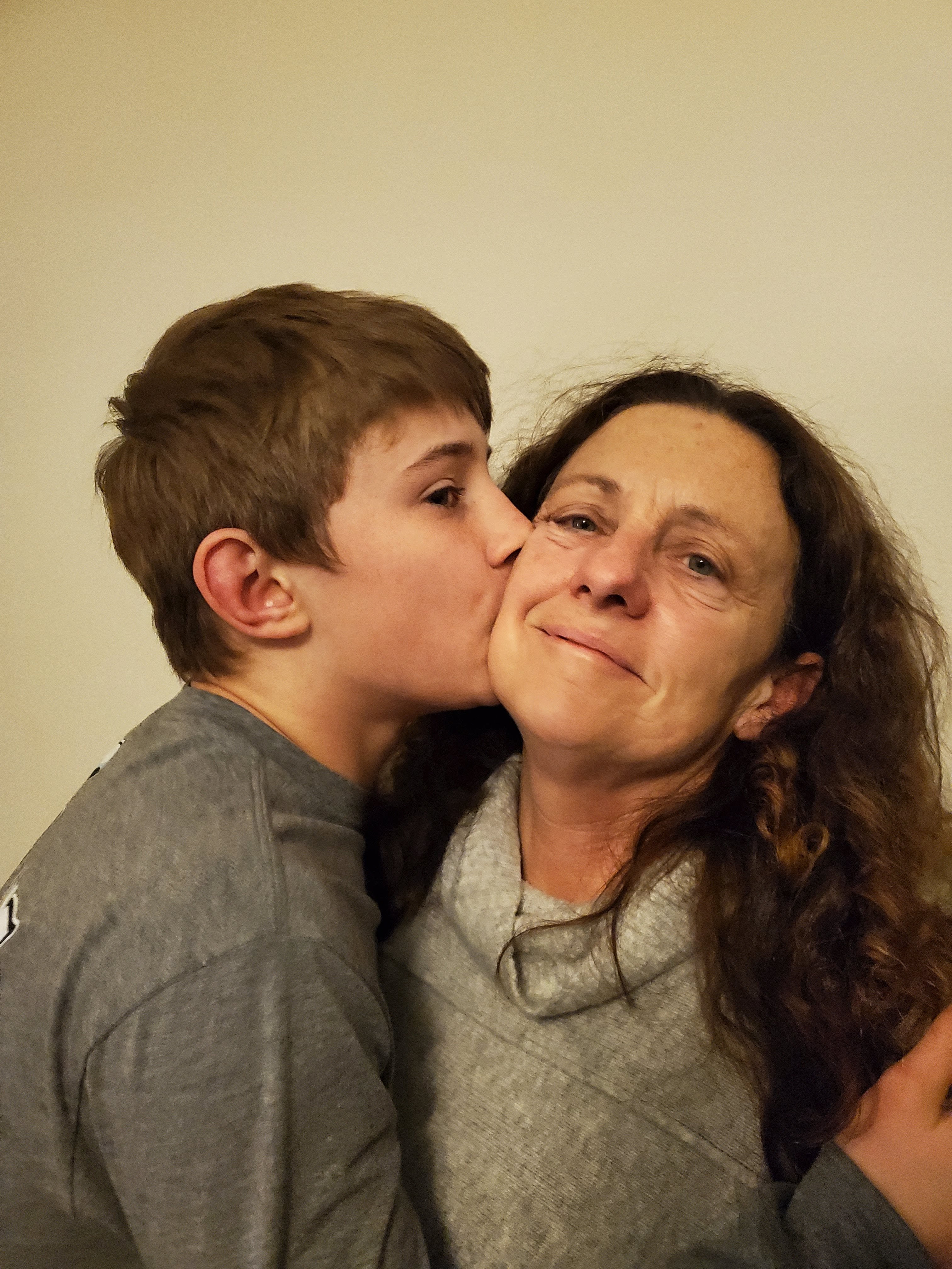 Painting of a boy kissing a woman on the cheek