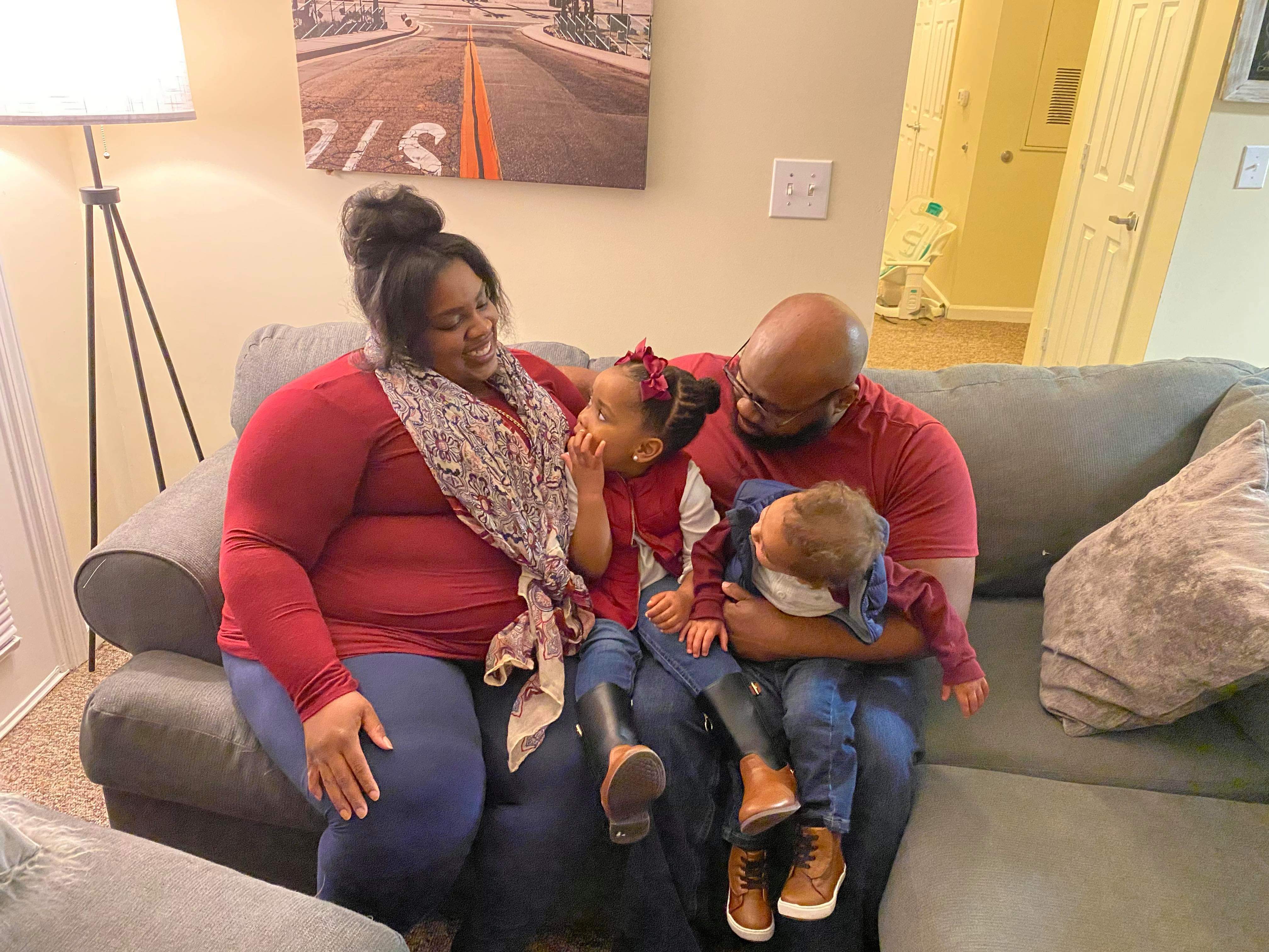 Painting of a Black family: a mother, father, toddler girl, and baby.