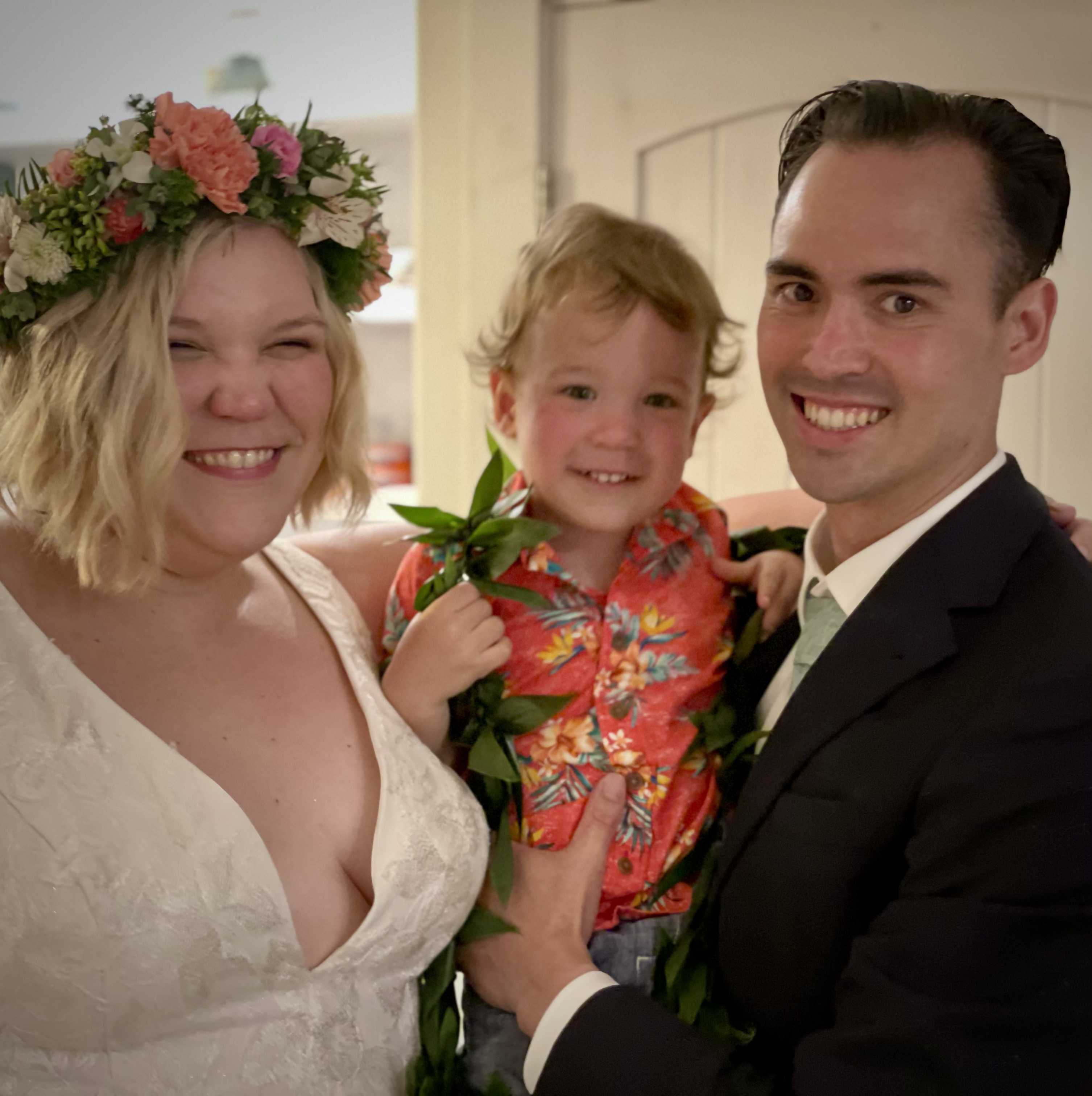 Painted portrait of a family: a woman in a flower crown, a toddler in a floral shirt, and a man in a suit.