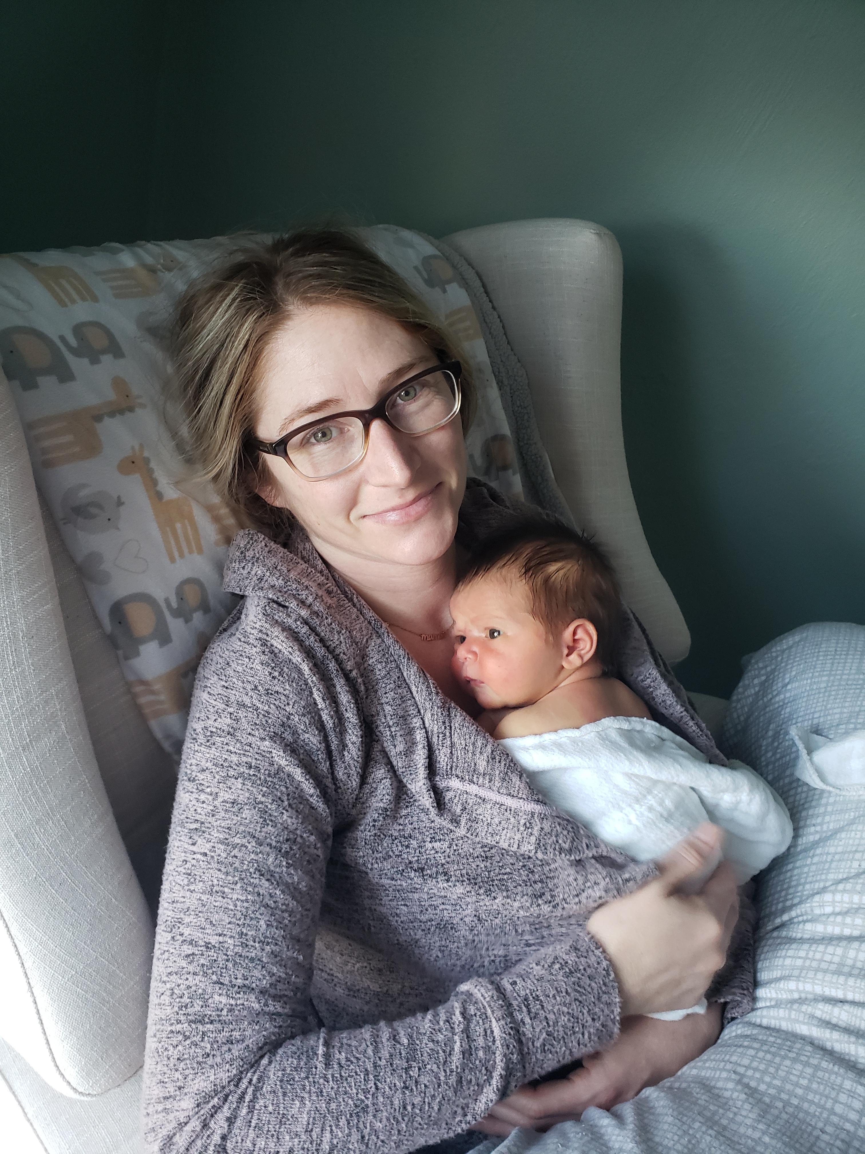 Oil painting of a mother holding her newborn baby.