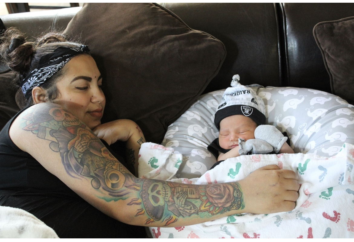 Painting of a tattooed mother sleeping with her baby.