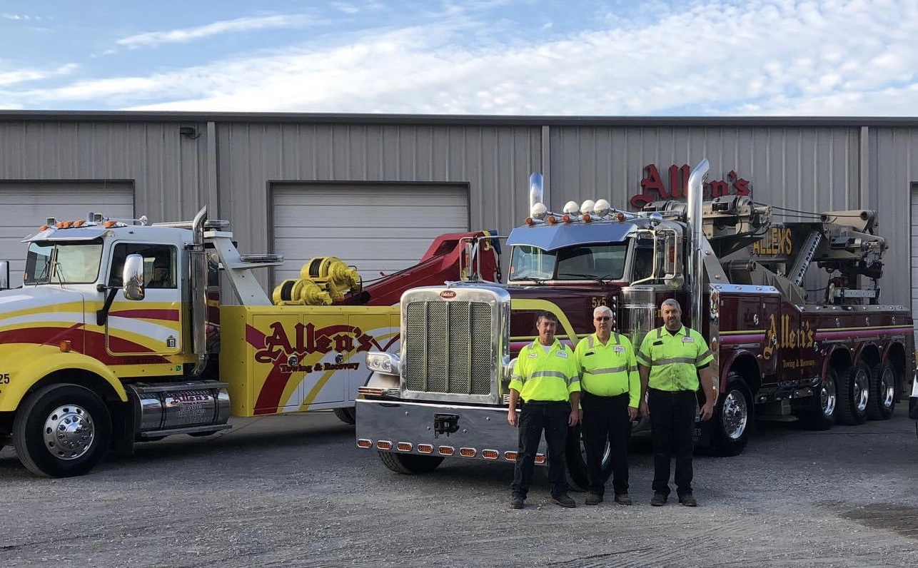 Painting of three men in work uniforms standing in front of two Allen`s Towing & Recovery trucks.