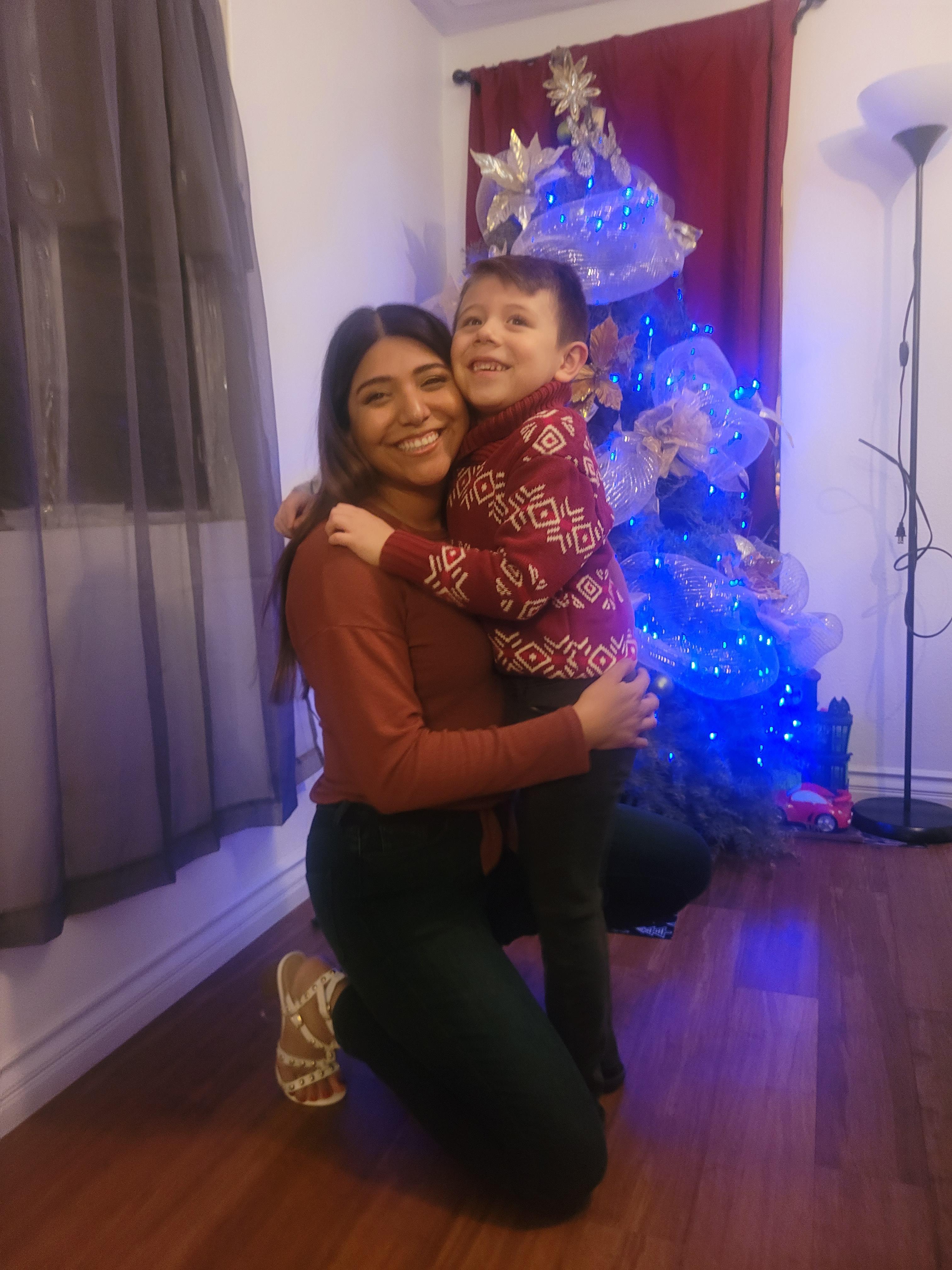Portrait of a woman and young boy smiling, with a forest background.