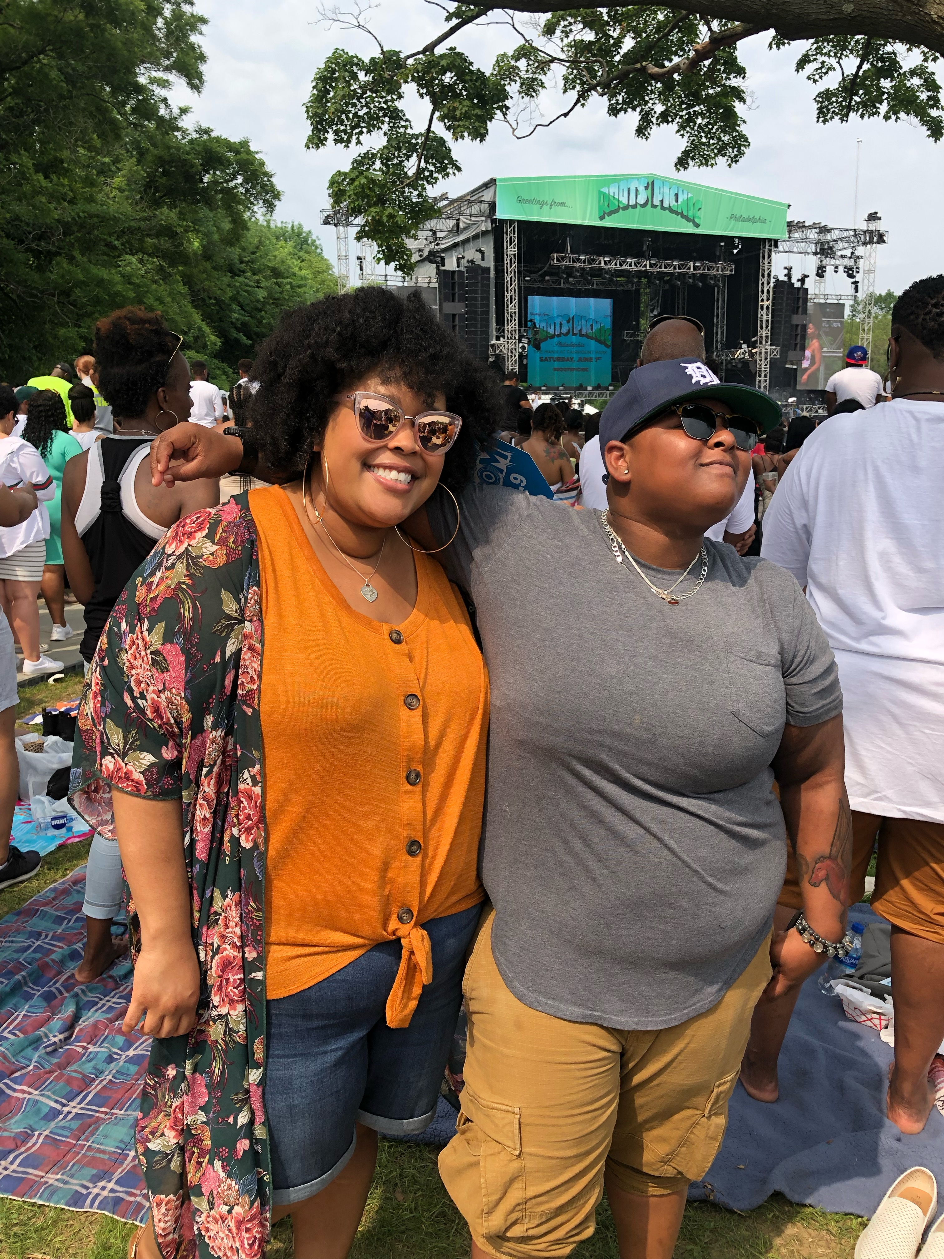 Painting of two smiling women standing together at an outdoor concert.
