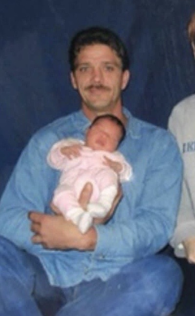 Painting of a smiling man wearing glasses holding a baby.