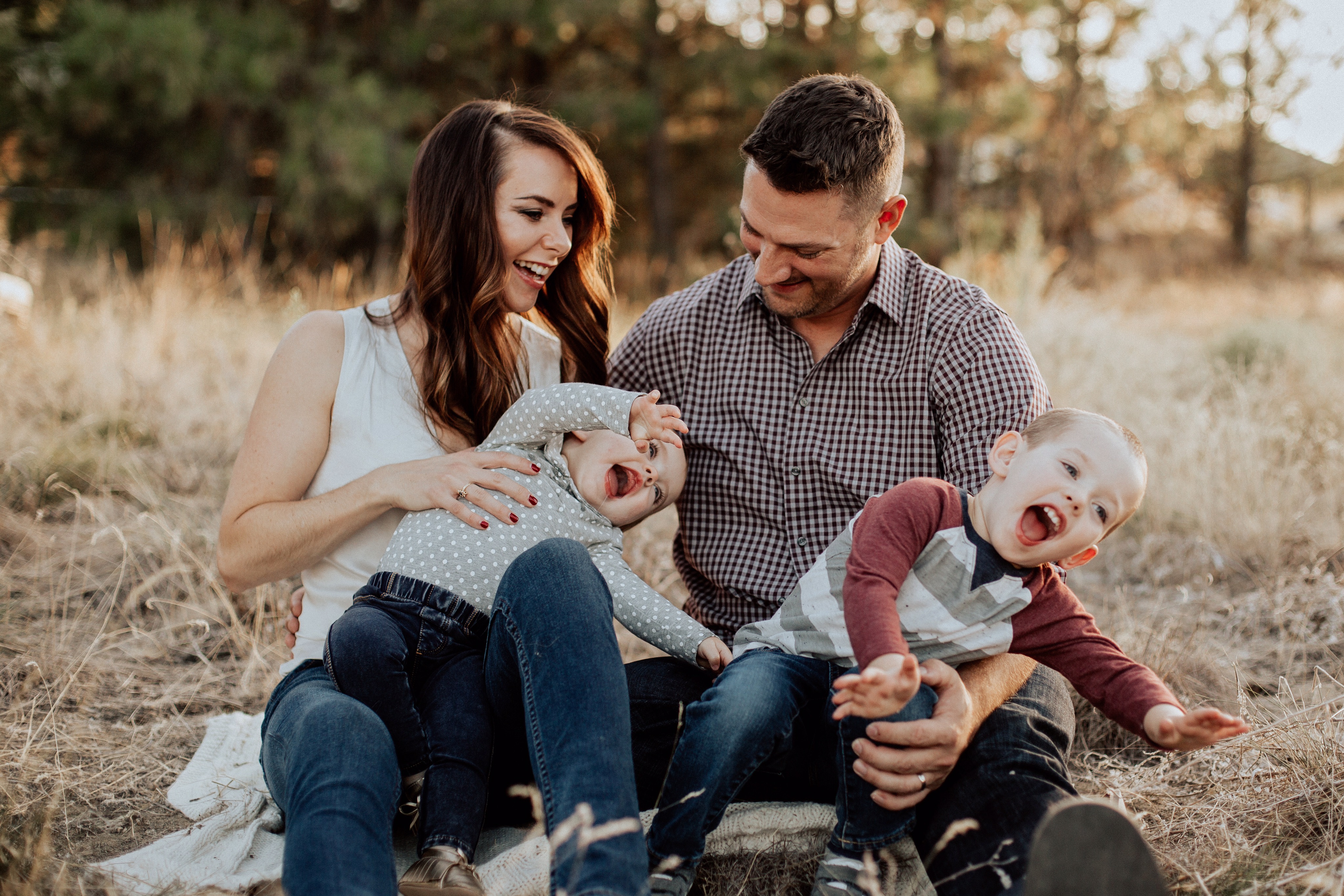 Painting of a family portrait: a mother, father, baby, and toddler laughing together outdoors.