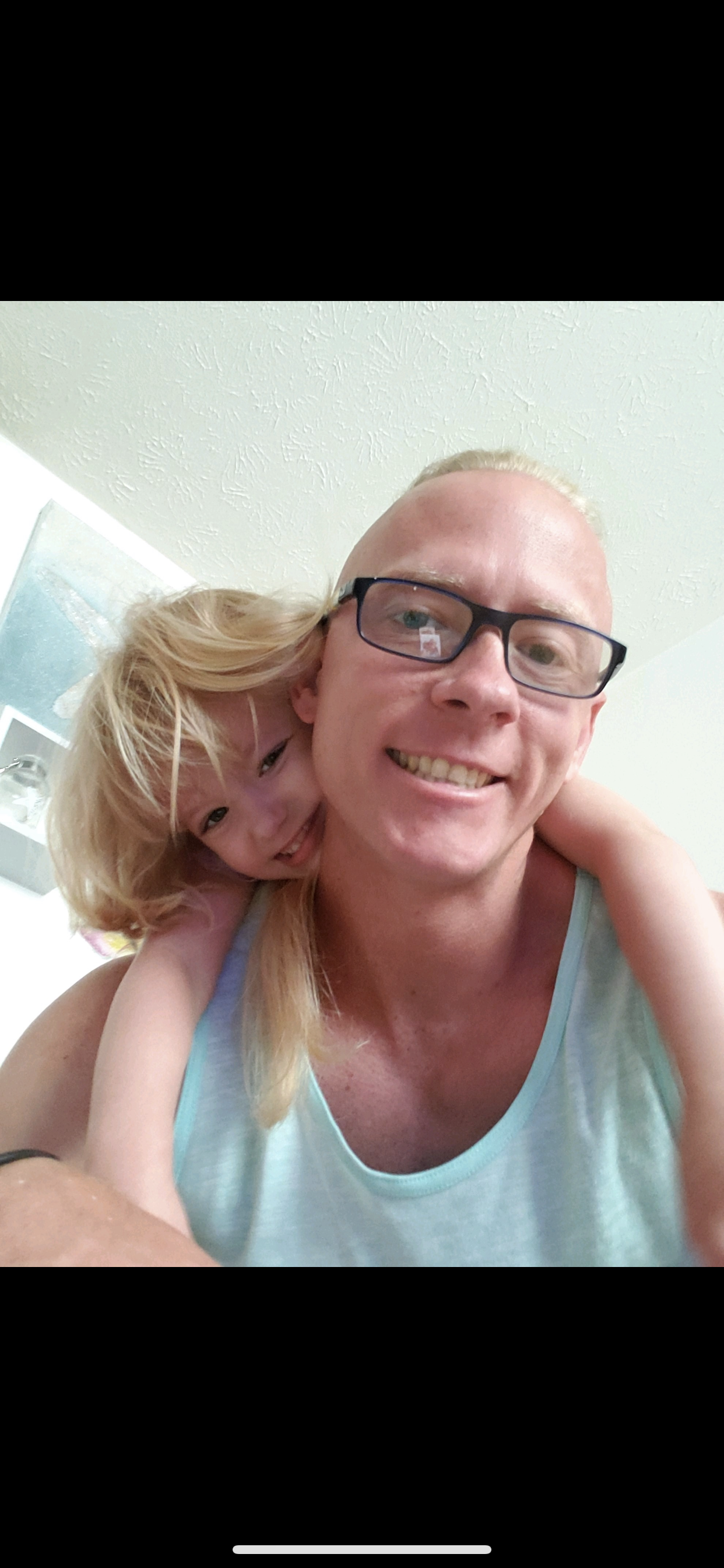 Painting of a father and daughter, the daughter has blonde hair and is hugging her father from behind.