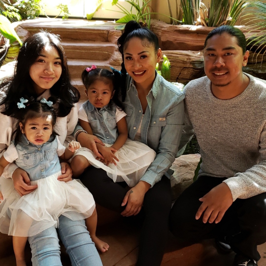 Family portrait painting, two parents, two young daughters.