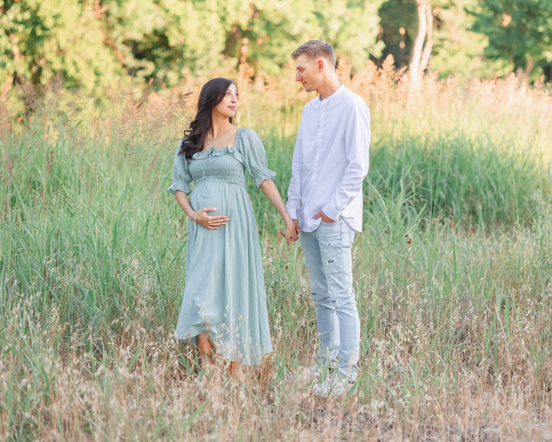 Pastel portrait of a pregnant woman and man holding hands in a field.