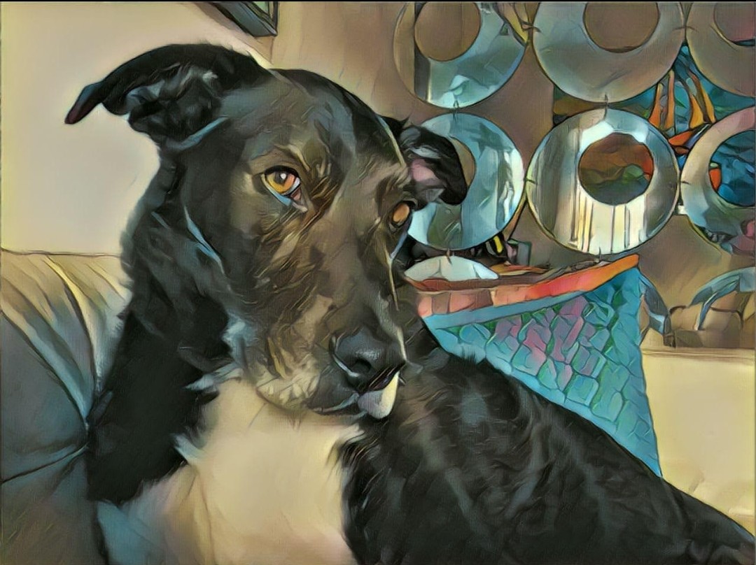 Painting of a black dog resting on a couch, with abstract circular shapes in the background.