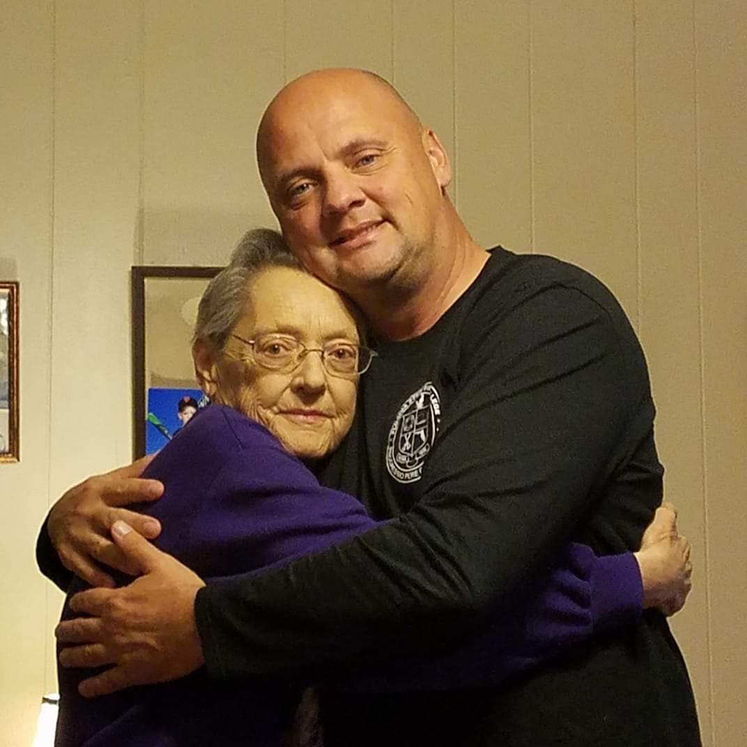 Pastel portrait of a bald man embracing an older woman with glasses, halo behind the man, wing visible at the left.