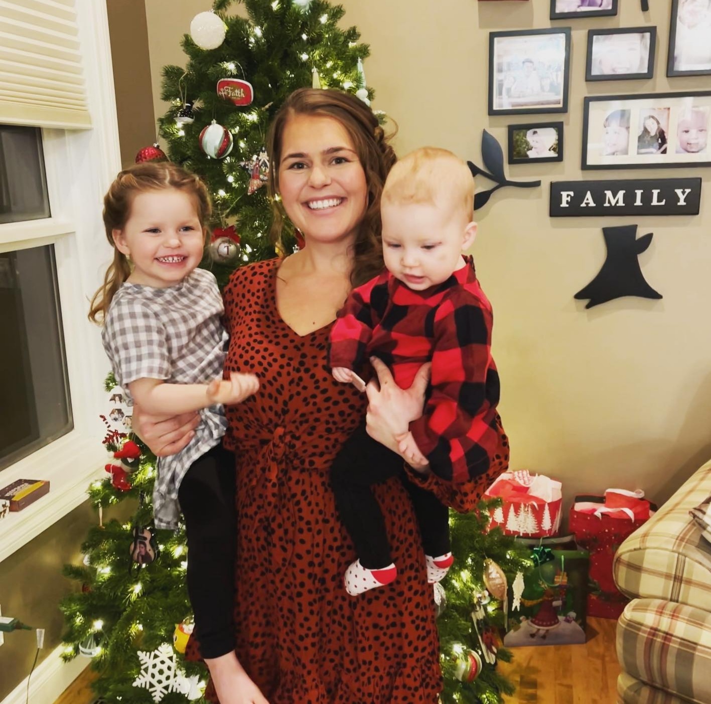 Portrait of a mother holding a toddler and young girl in front of a Christmas tree.