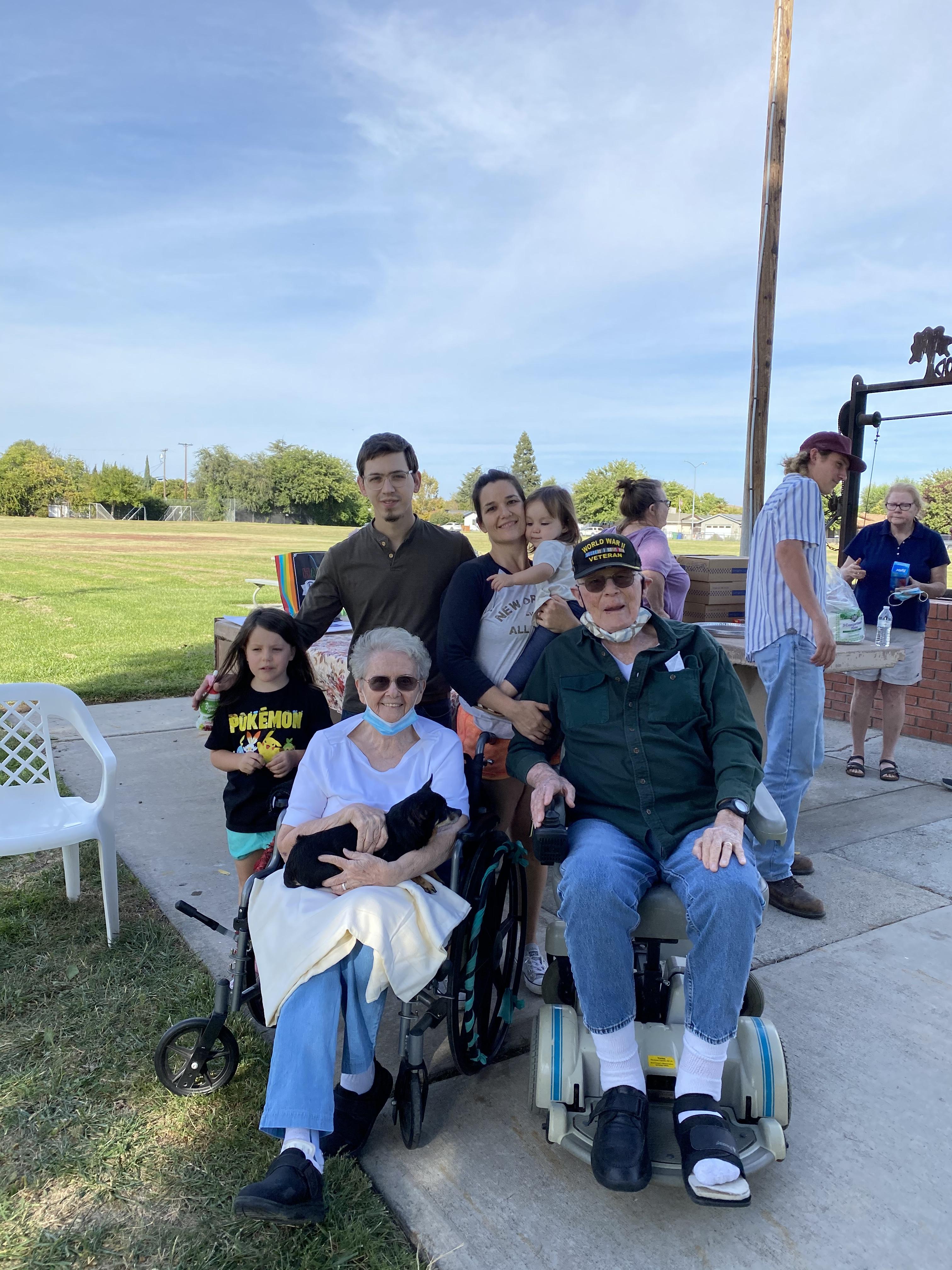 Family portrait painting, outdoors, six people.