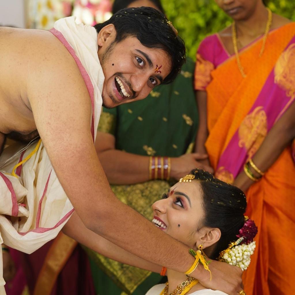 Painting of a joyful wedding ceremony, featuring a bride and groom embracing.