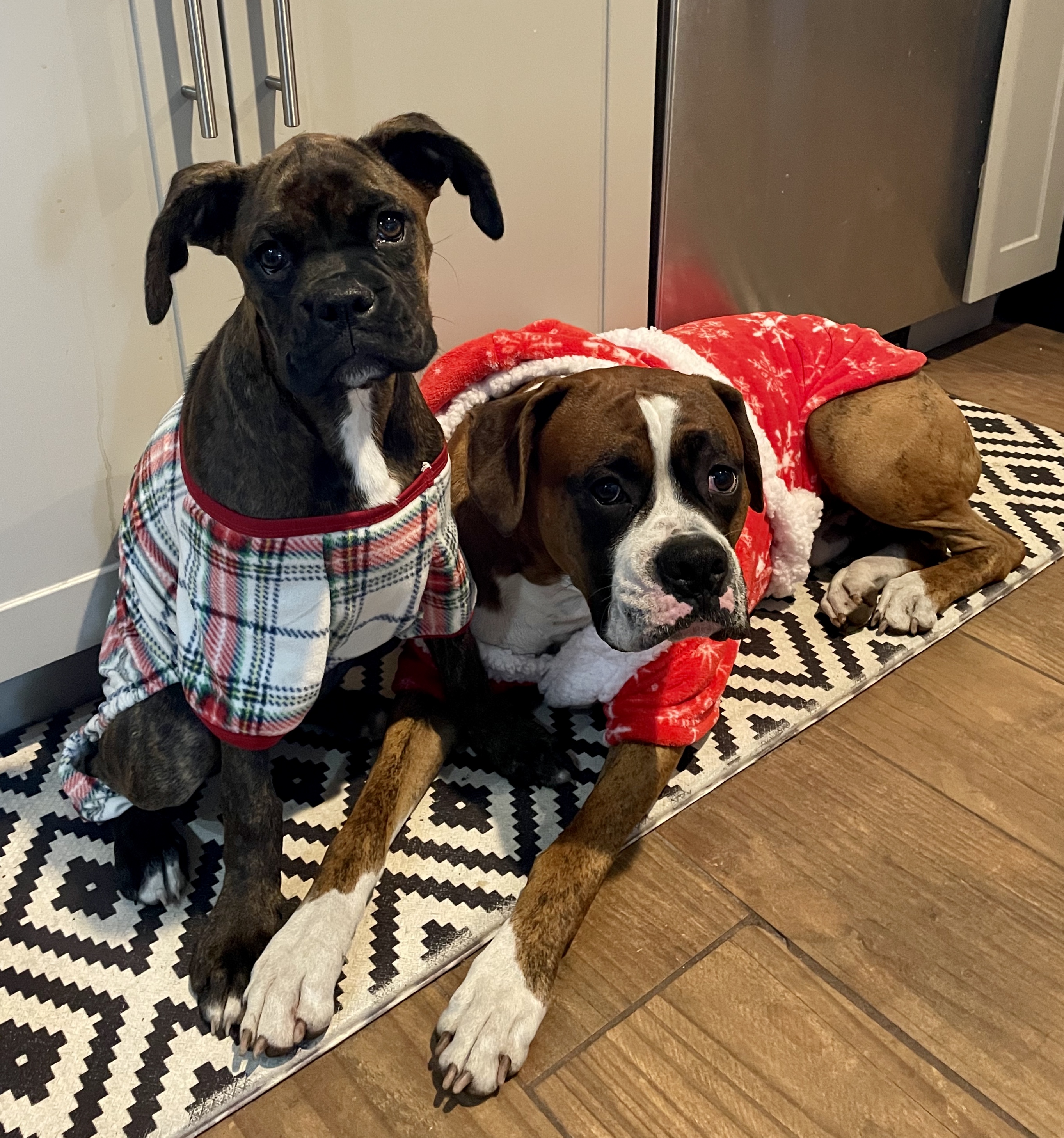 Two Boxer dogs wearing holiday sweaters sit on a rug.