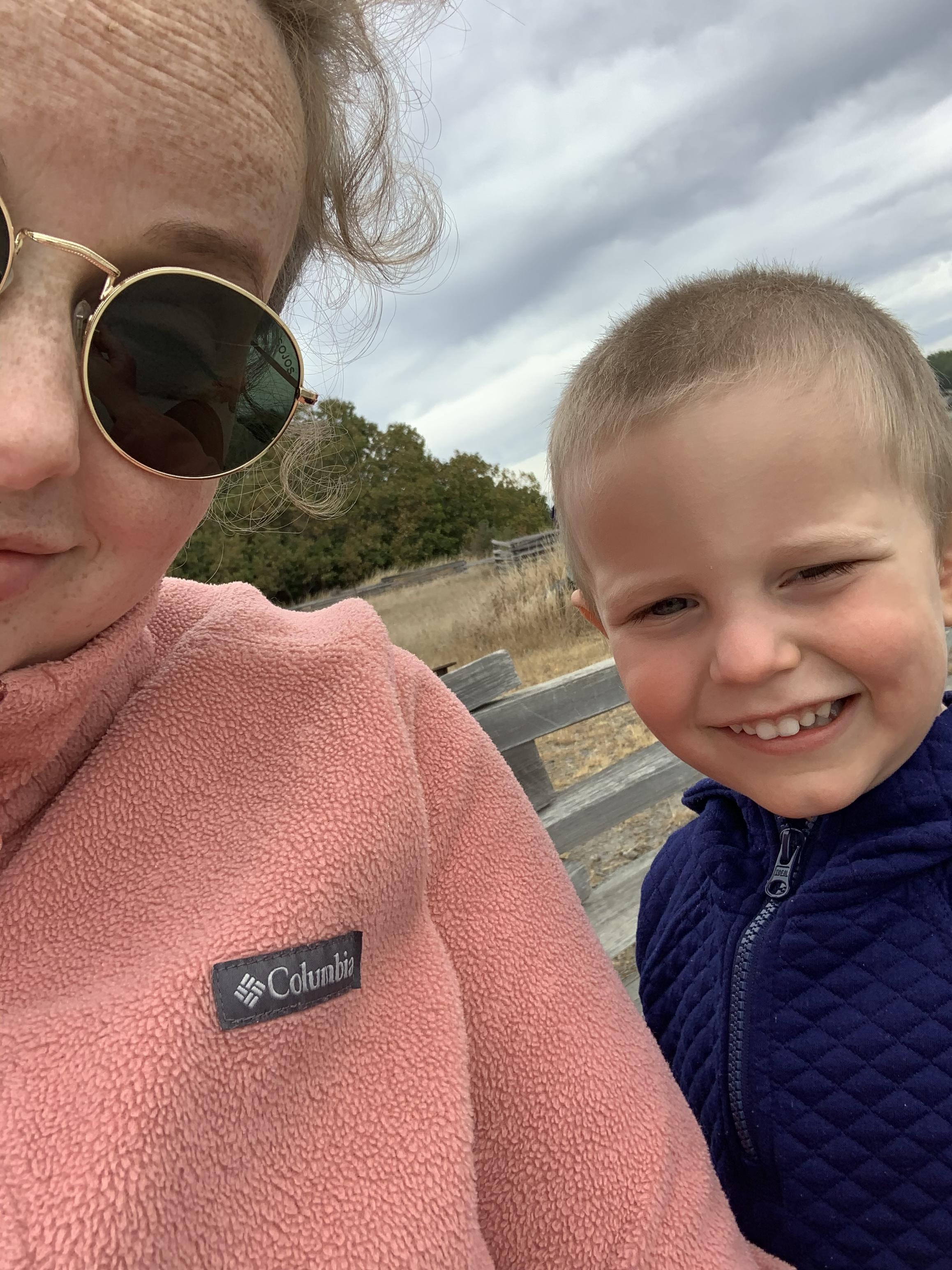 Portrait drawing of a smiling man in a cowboy hat next to a light gray horse.