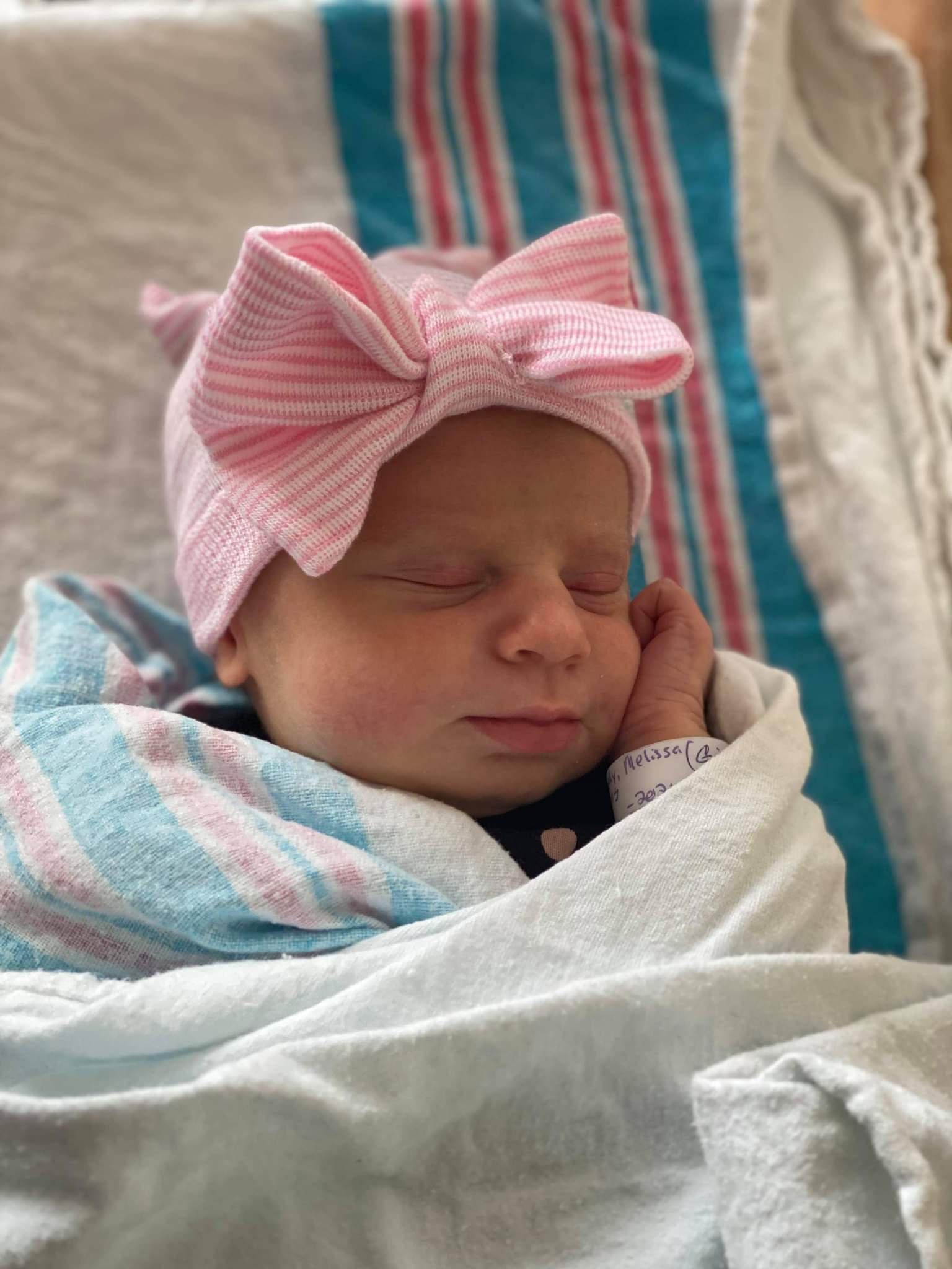 Pastel portrait of sleeping newborn wearing pink striped hat and blanket.