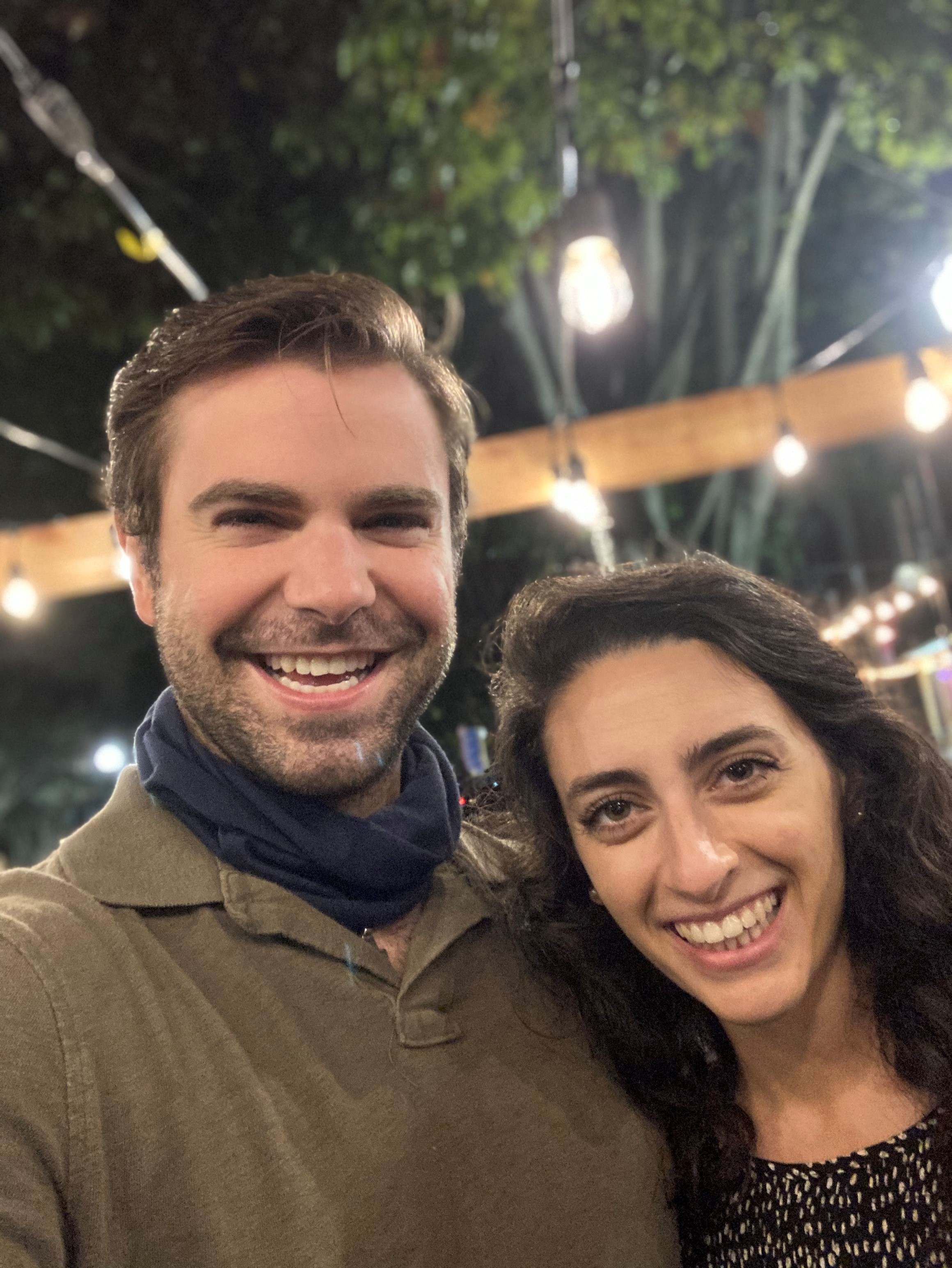 Pastel portrait of a laughing couple in front of a Christmas tree.