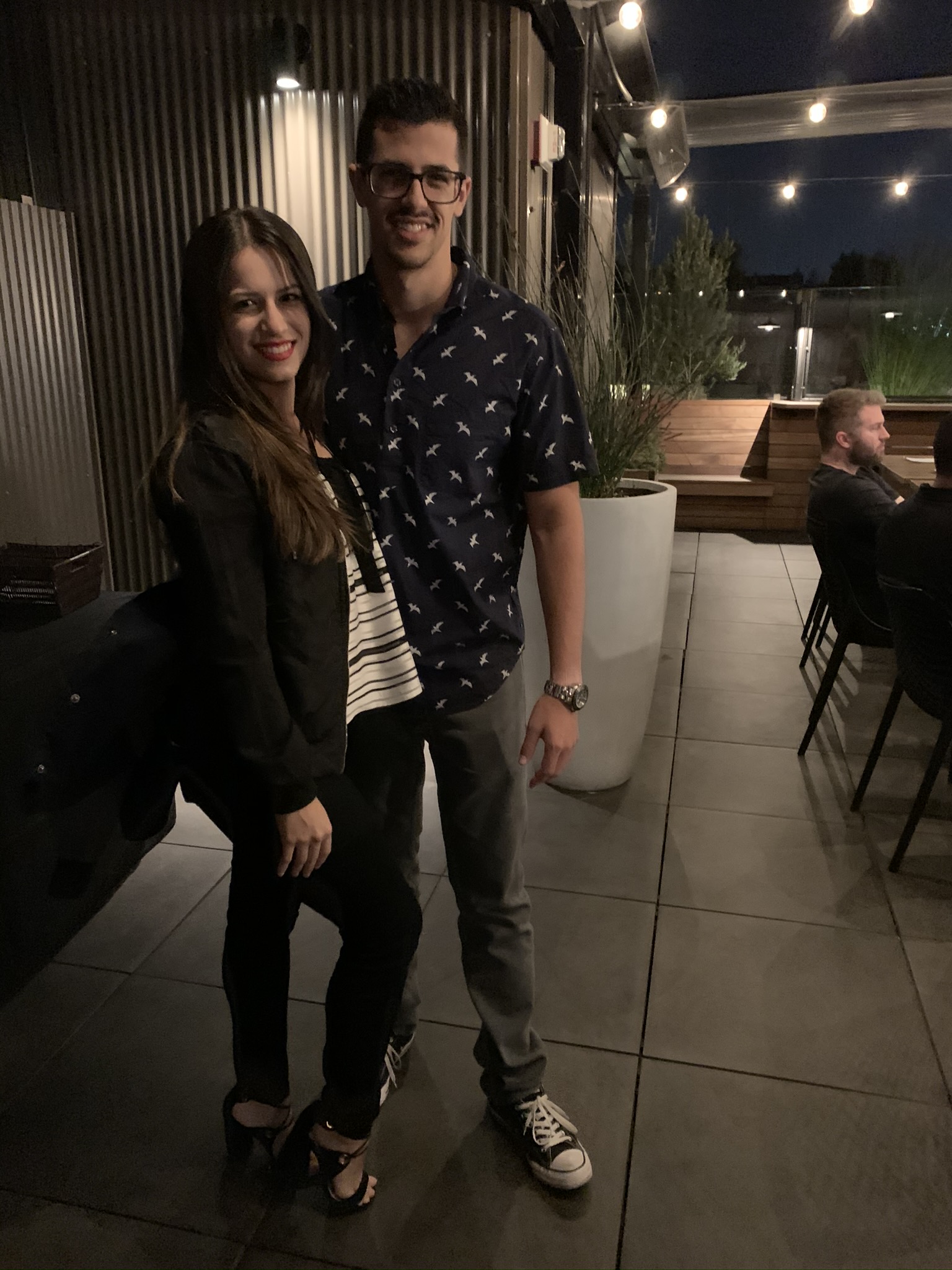 Smiling couple selfie, stadium reflected in woman`s sunglasses.