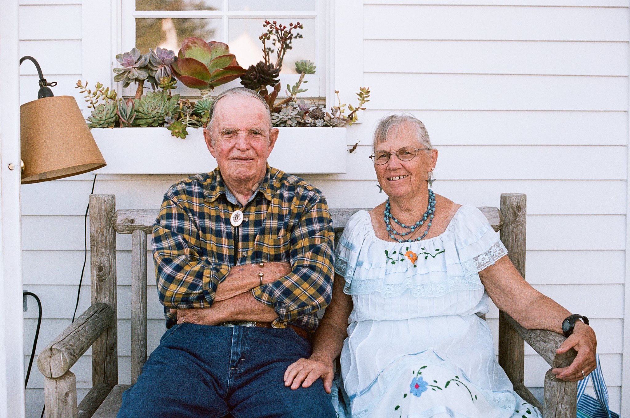 Portrait of elderly couple sitting on a bench outdoors.