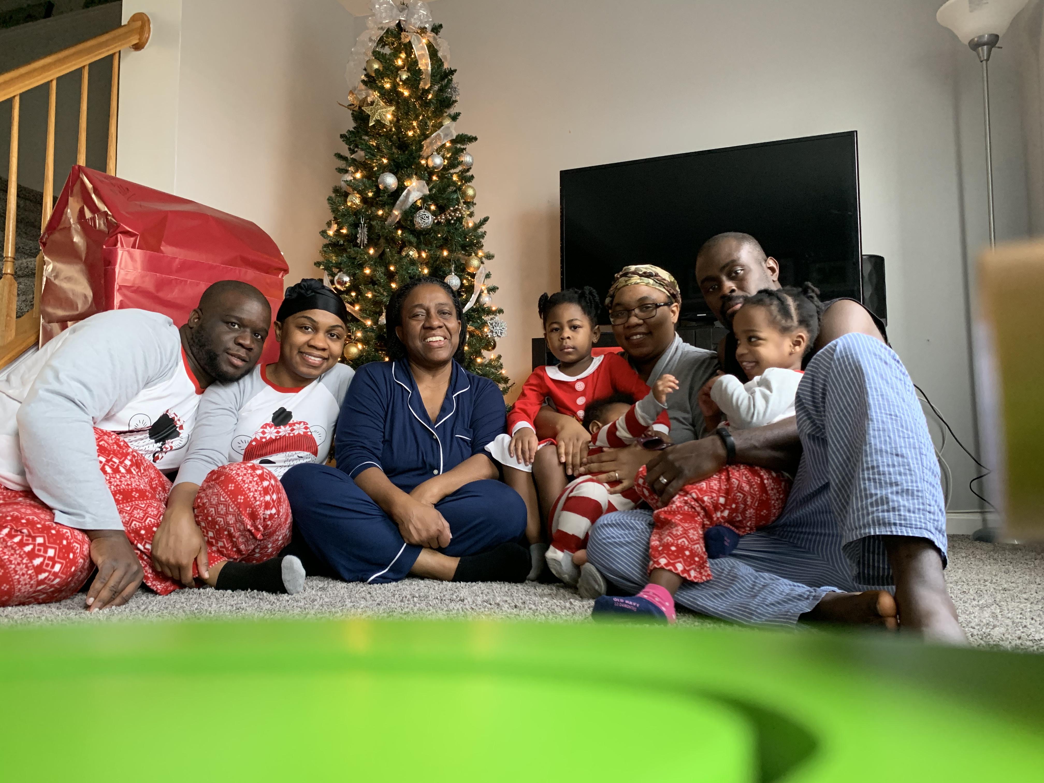 Pastel portrait of a family: two adult men with glasses, a woman, a teenage boy, a young boy, and a young girl.