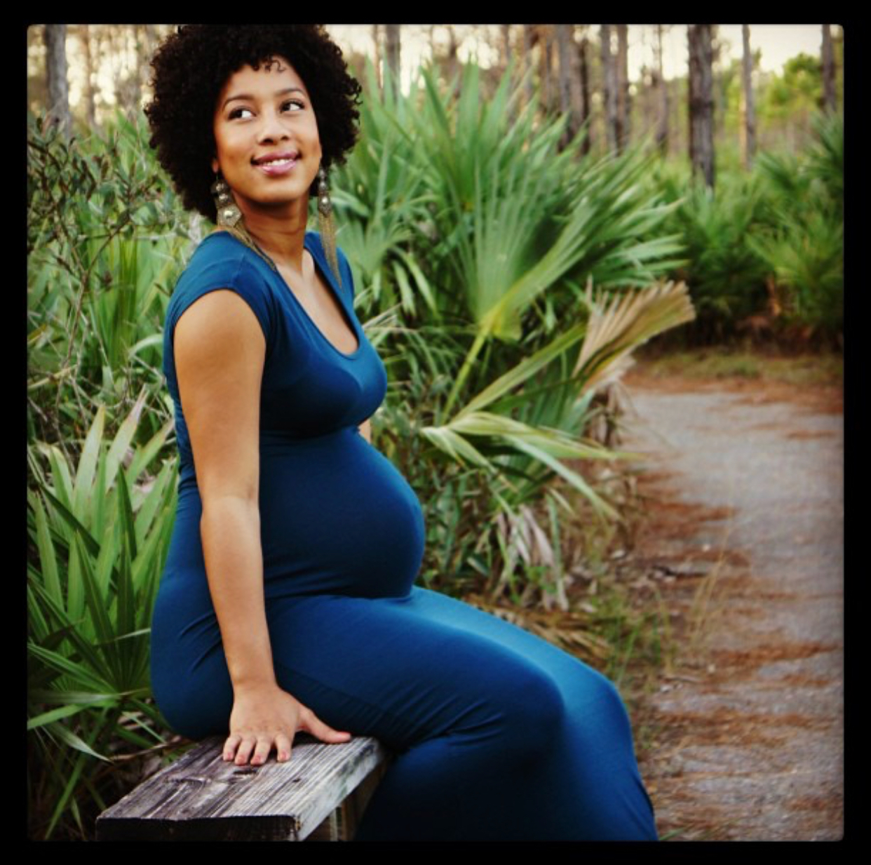 Painting of a smiling pregnant woman in a blue dress, looking off to the side.