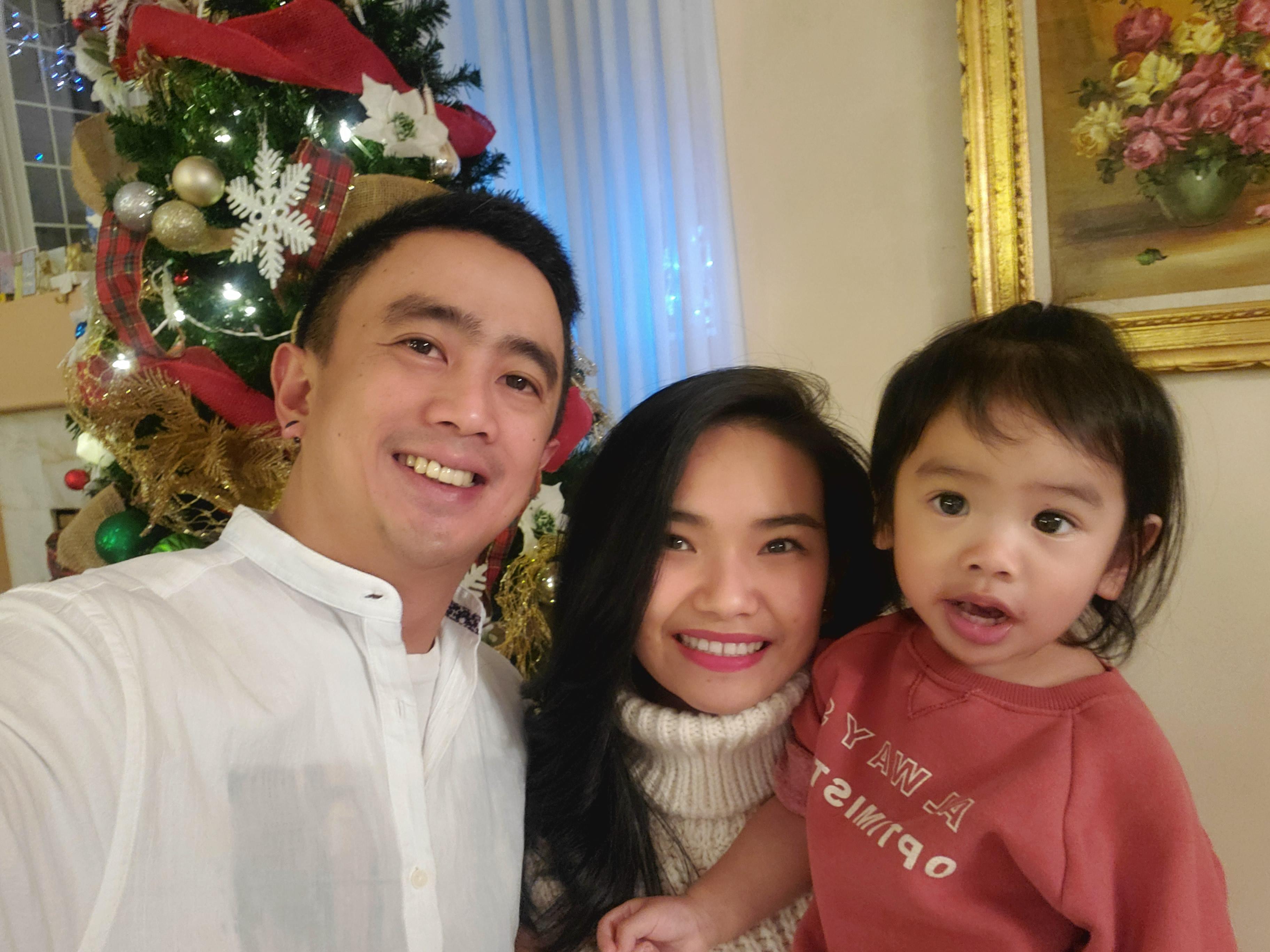 Painting of a family portrait: a father, mother, and young child.