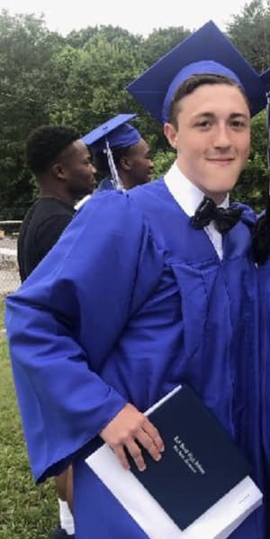 Painting of a graduate in a blue cap and gown with his mother, who is wearing a red sweater.