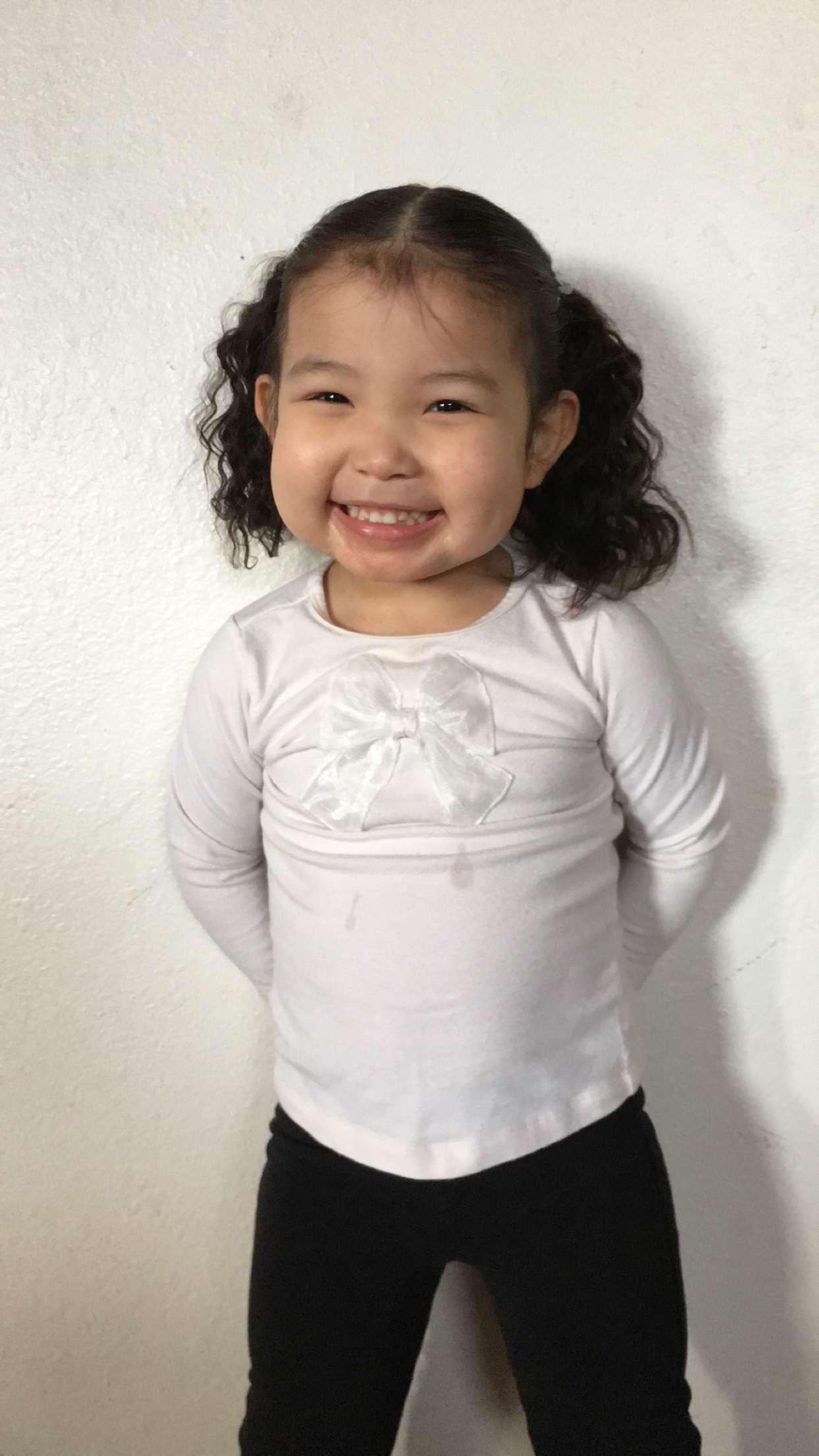 Portrait of a smiling young girl with curly brown hair wearing a white shirt with a bow.