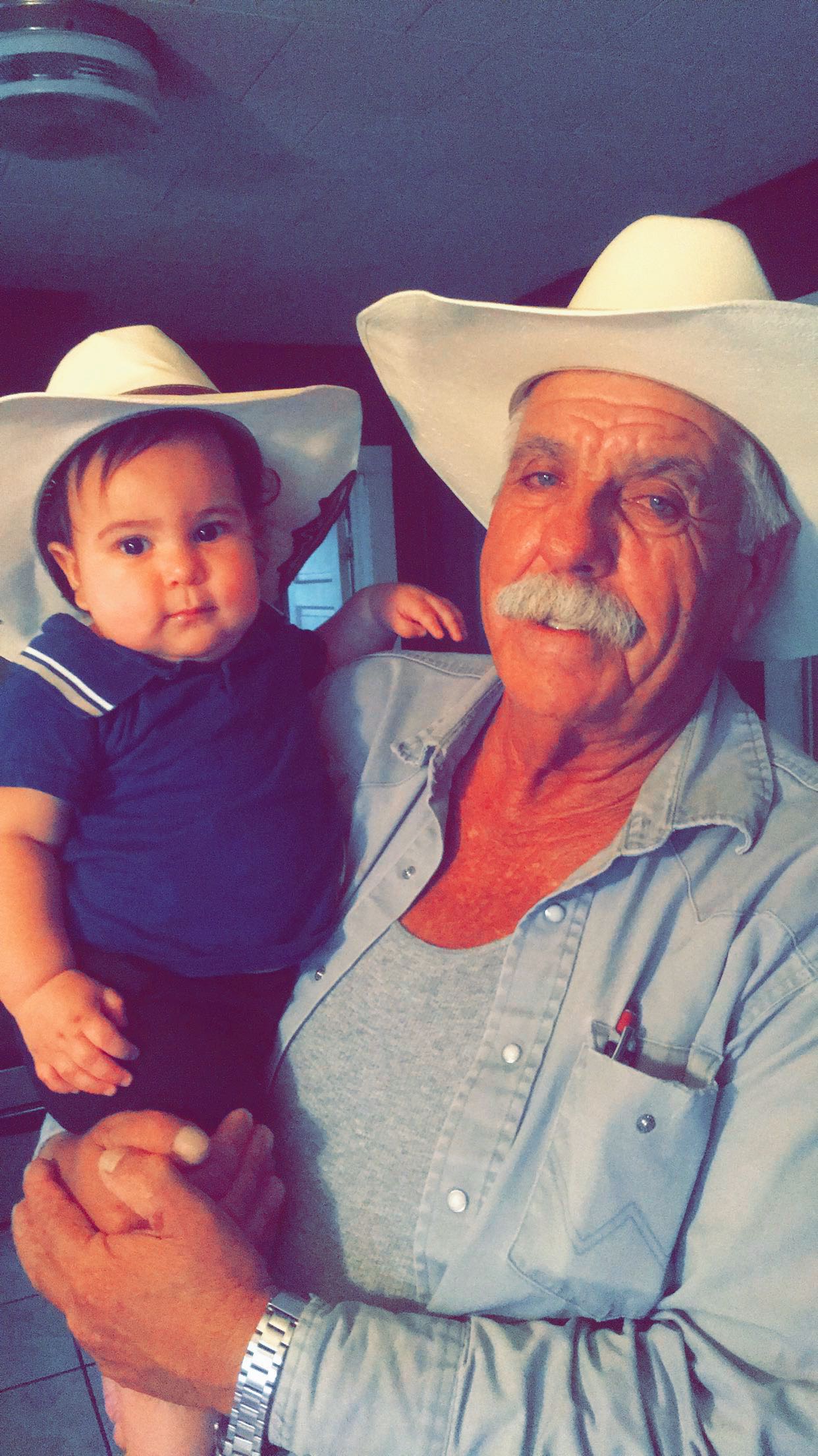 Painting of a smiling elderly man in a cowboy hat holding a baby wearing a similar hat.